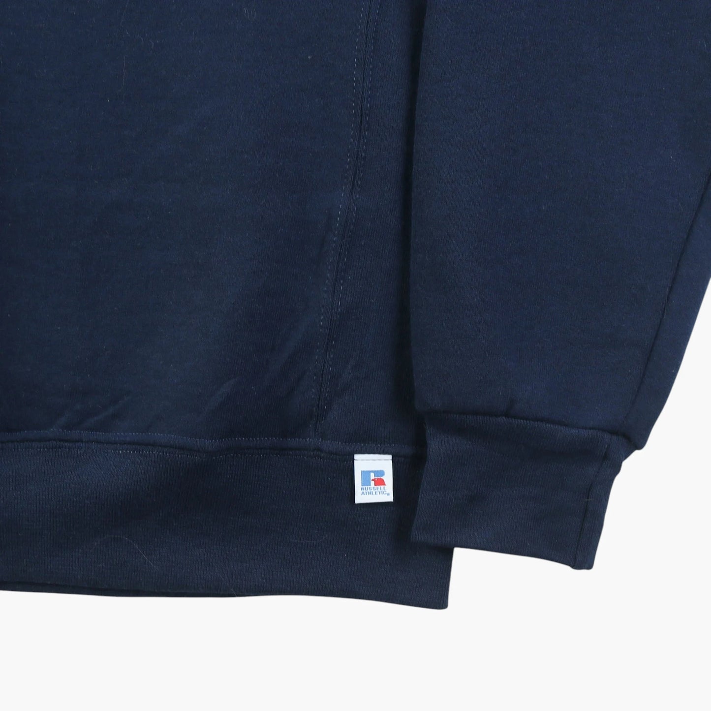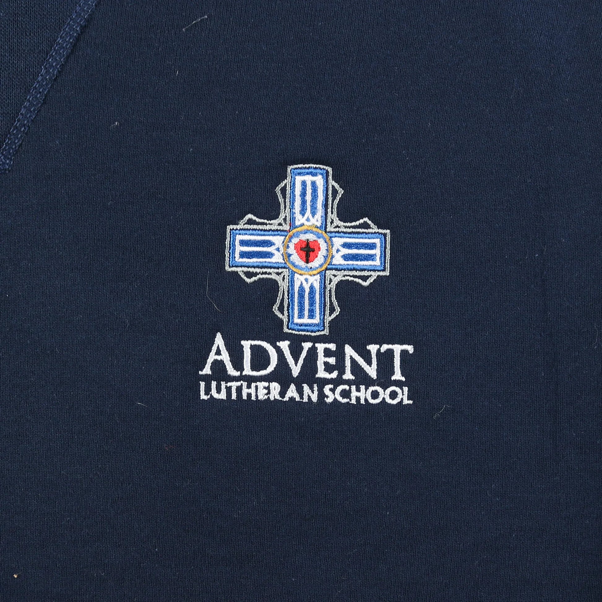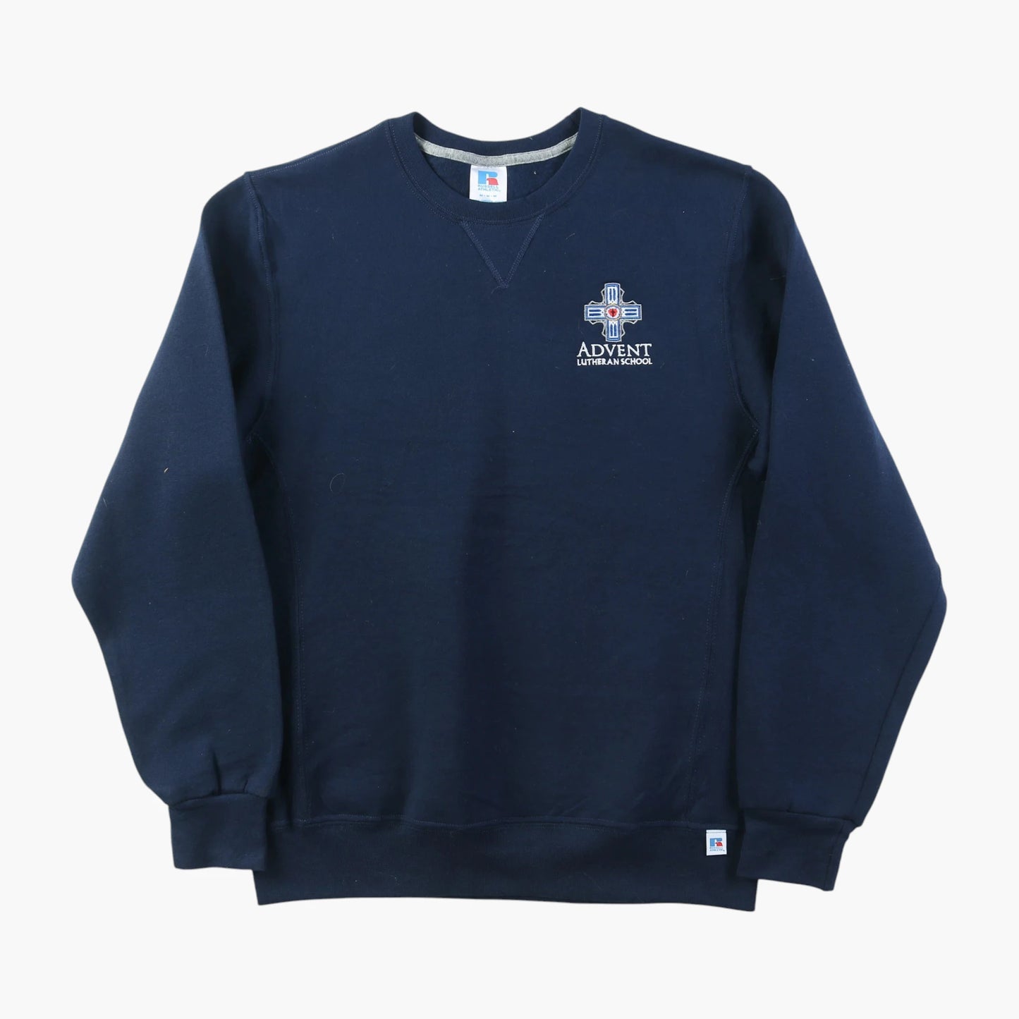 Vintage Russell Athletic Crewneck Sweatshirt in Navy. Navy blue crewneck sweatshirt with embroidered Advent Lutheran School logo on left chest, Russell Athletic branding on neck tag and hem. Cotton-blend fleece-lined, ribbed trim, and classic collegiate v-stitch at collar.