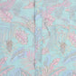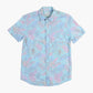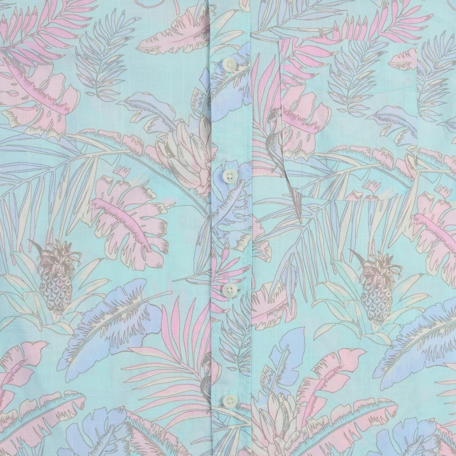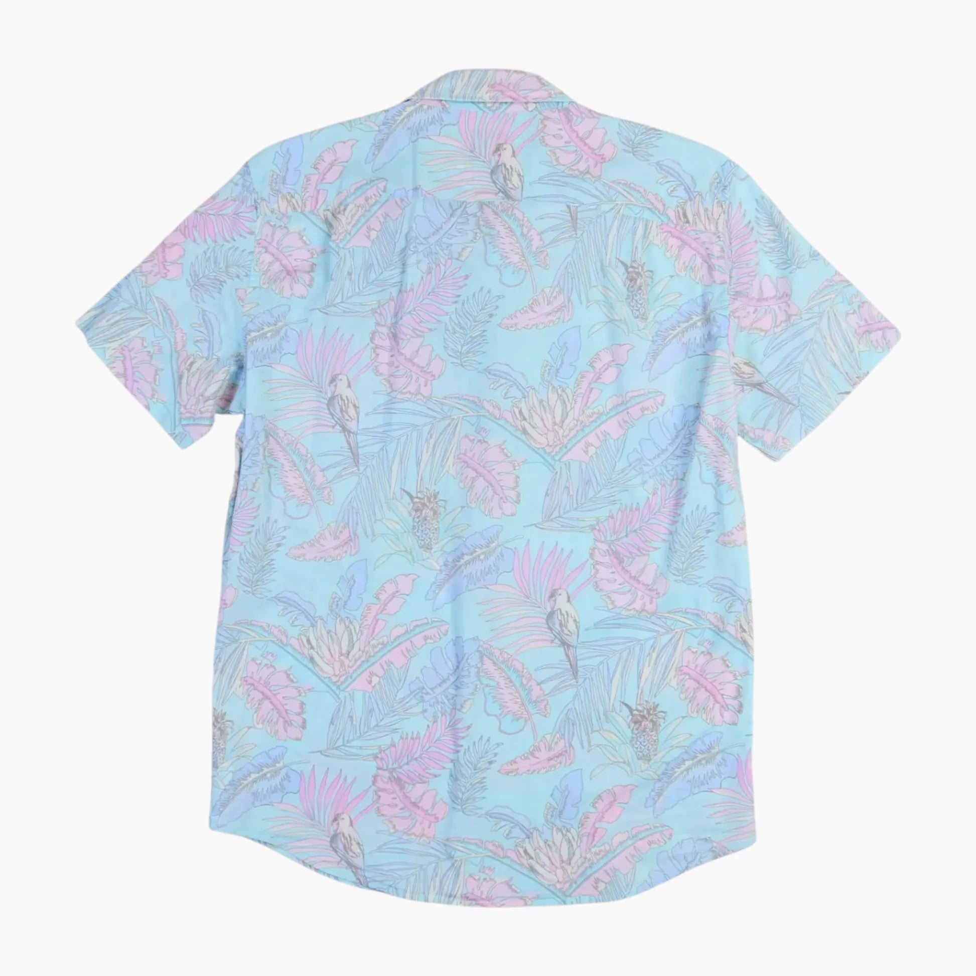 Vintage Hawaiian Aloha Shirts Shirt in blue. Pastel tropical-themed print showcasing shades of pink and green over a light blue background; short-sleeved with button-up front closure.