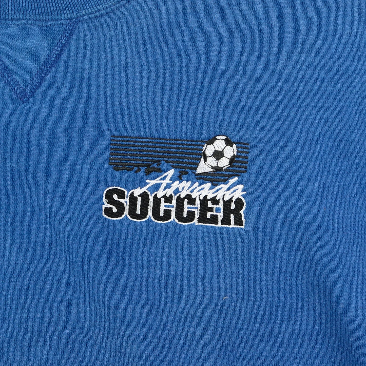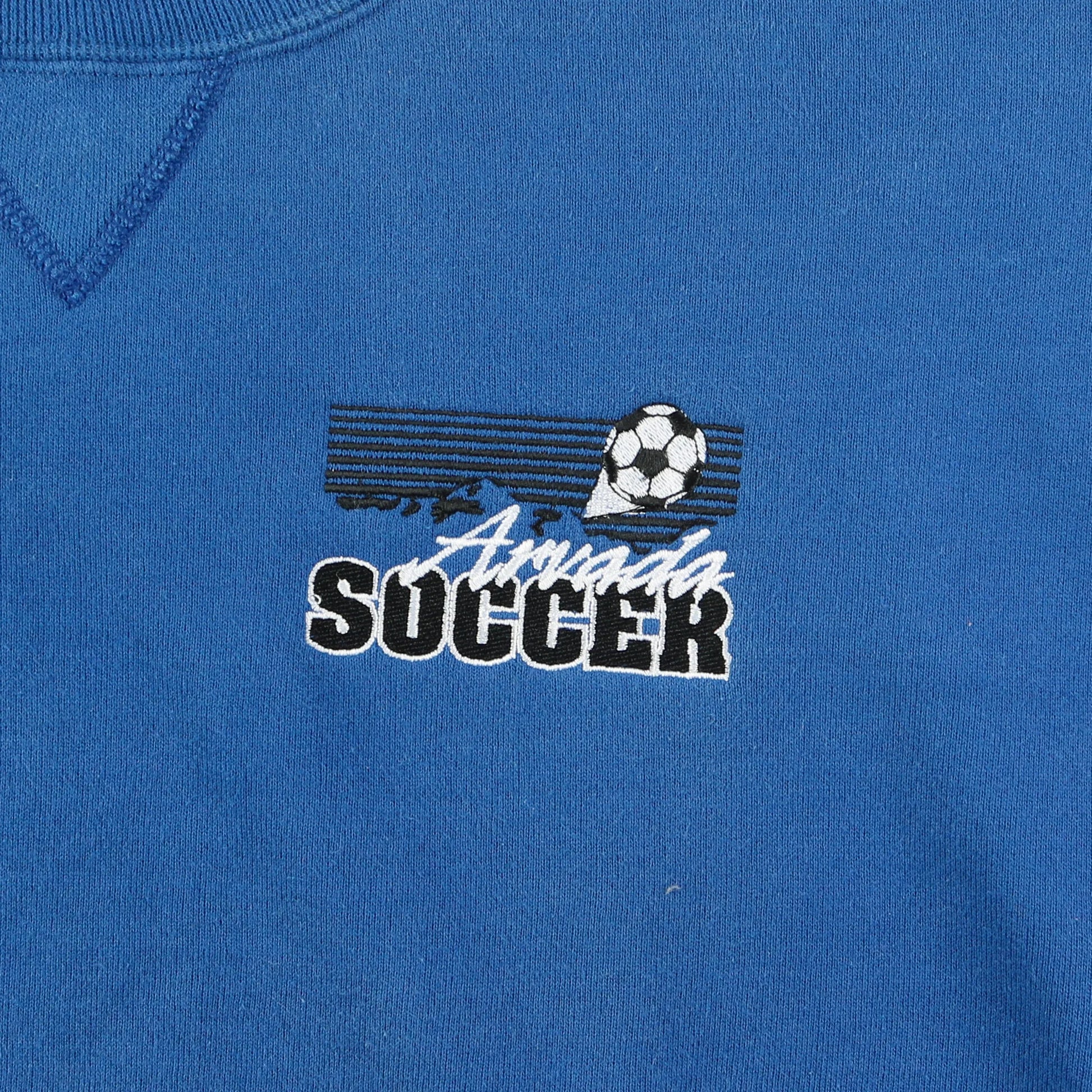 Vintage Russell Athletic Crewneck Sweatshirt in Blue. Blue crewneck sweatshirt with 'Arcadia Soccer' embroidered logo at the left chest, V-insert under the collar, ribbed cuffs/hem, made in USA by Russell Athletic, classic midweight fleece, visible Russell logo tag on waistband.