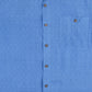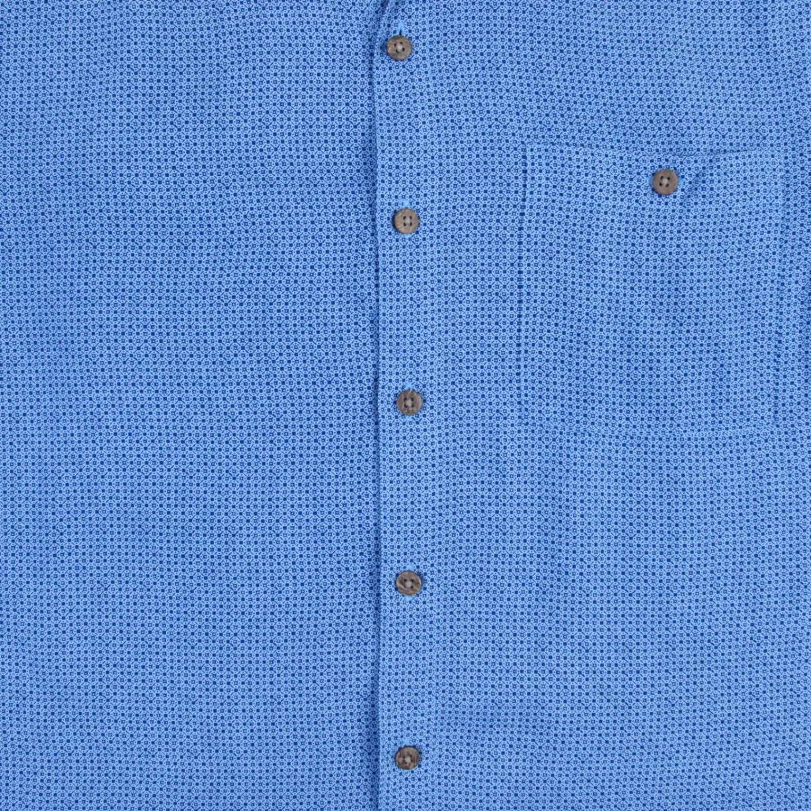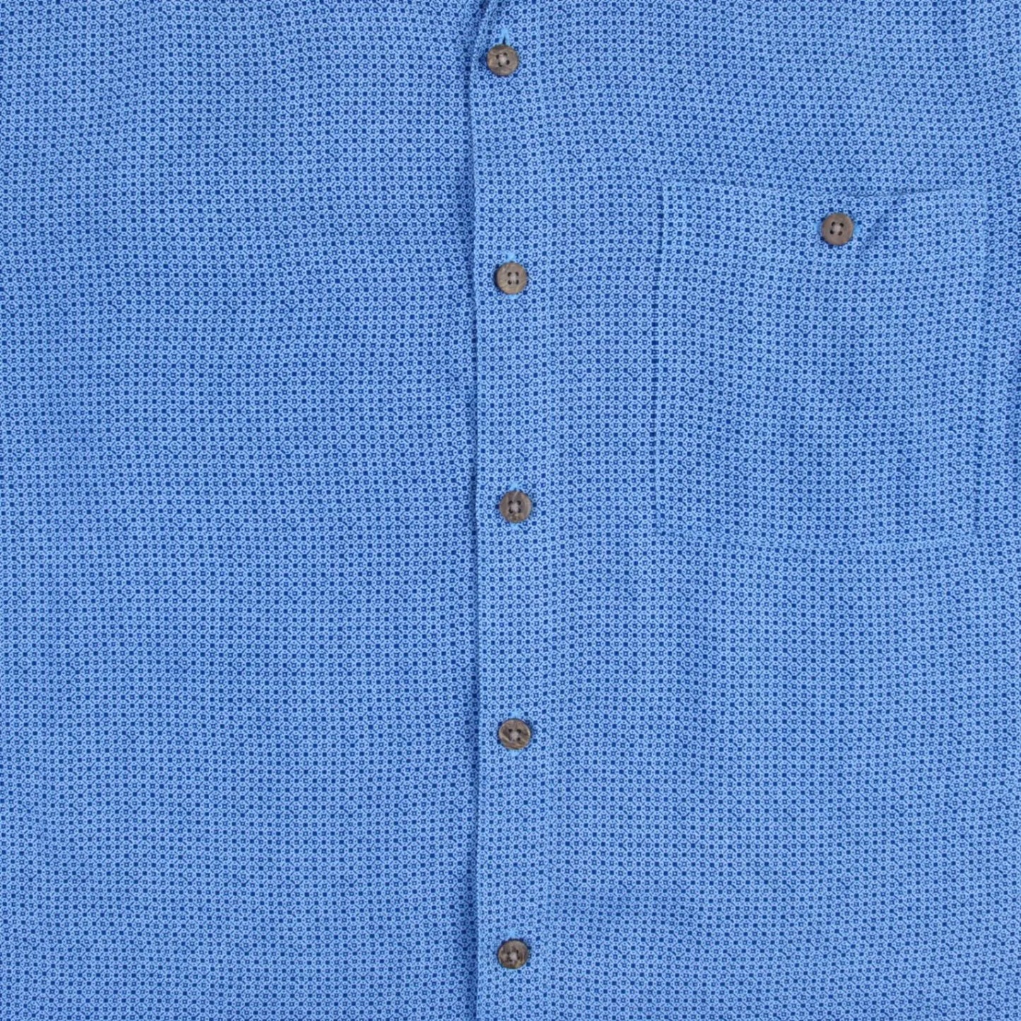 Vintage Hawaiian Aloha Short-sleeve Shirt in blue. This short-sleeved shirt is crafted from breathable fabric, featuring a single chest pocket with button detail, brown buttons, and noticeable geometric print texture.