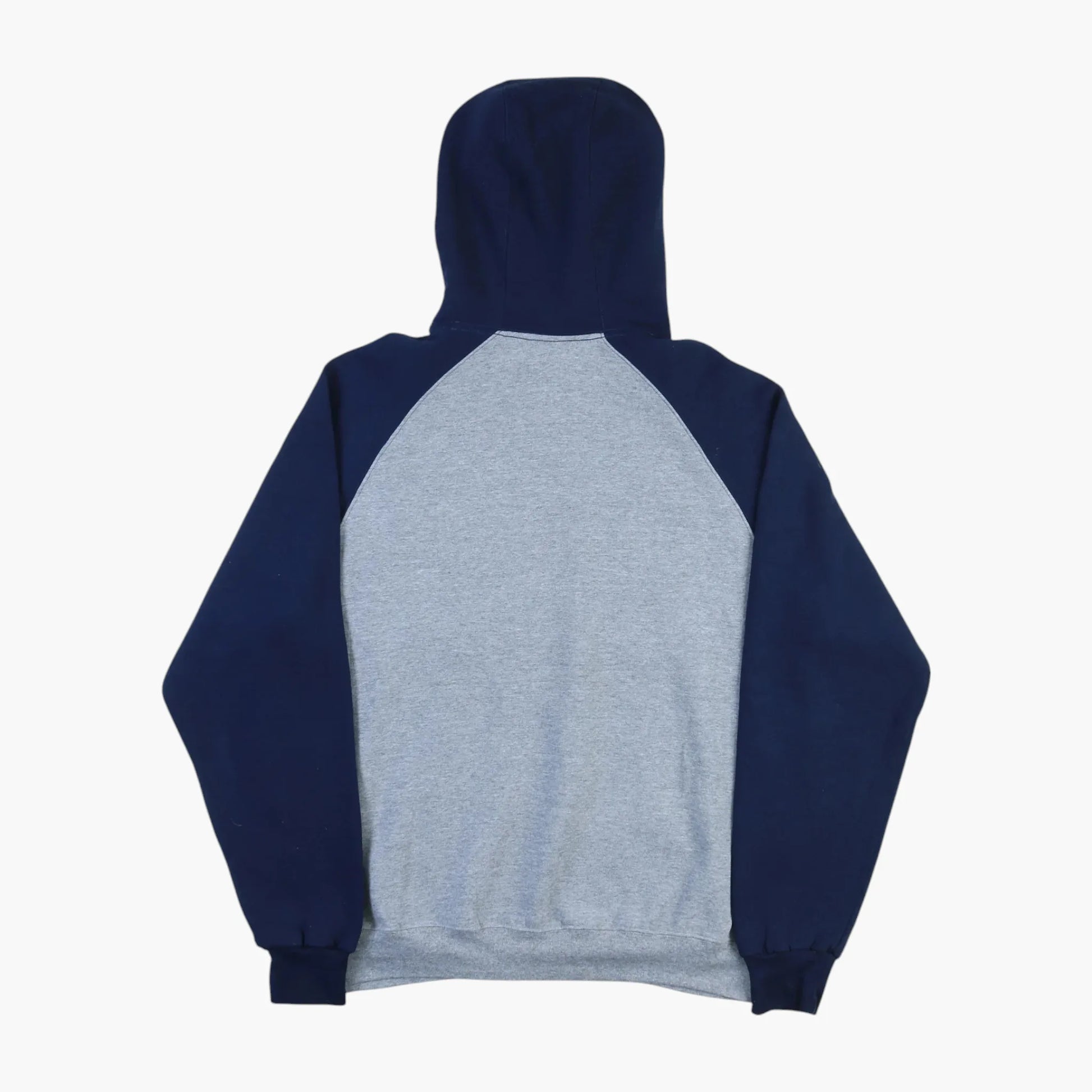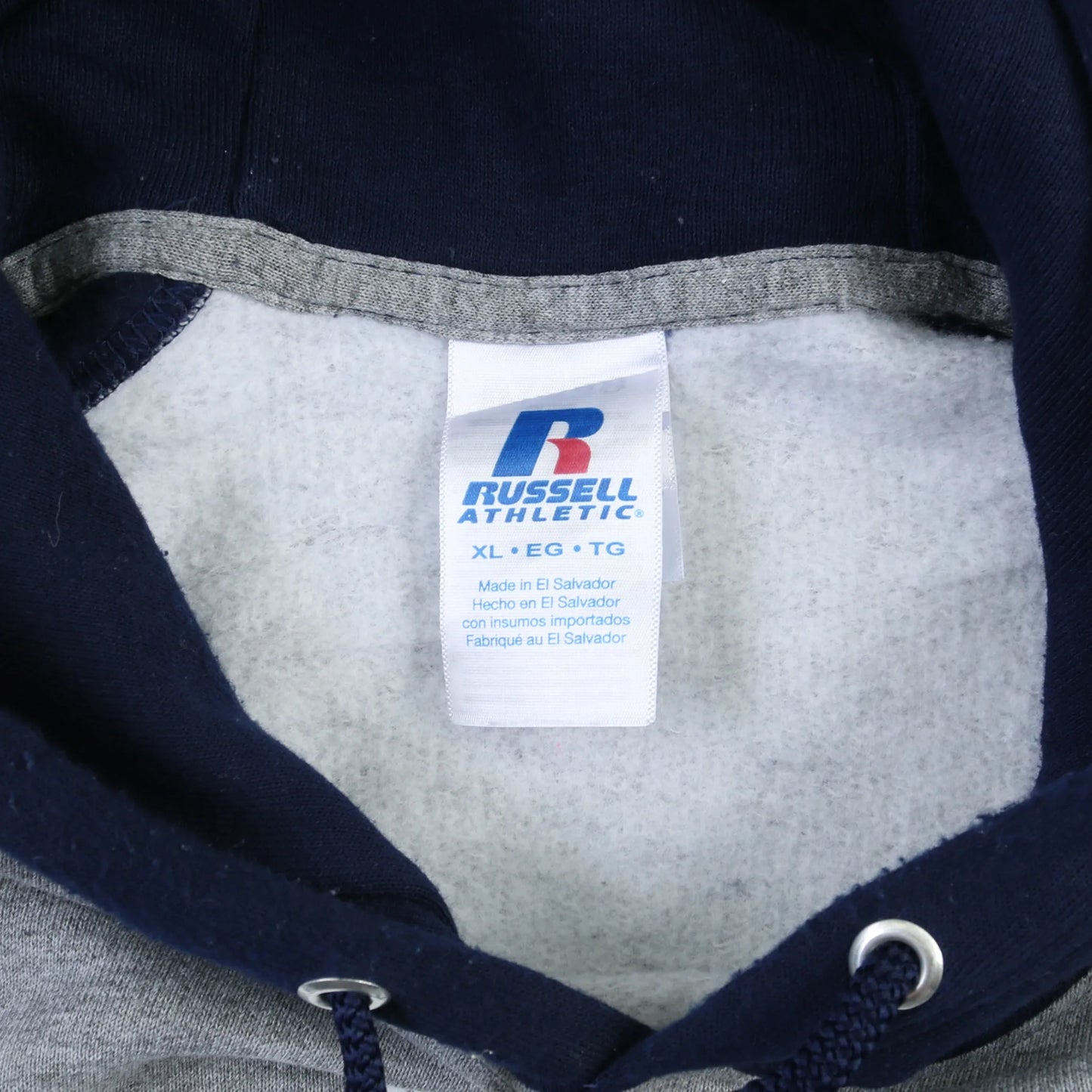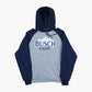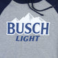 Vintage Russell Athletic Hoodie in Gray. Gray and navy two-tone hoodie with raglan sleeves, BUSCH LIGHT puff print graphic with mountains, fleece lining, ribbed cuffs and hem, drawstring hood.