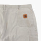 Vintage Carhartt Shorts in Stone. Utility work shorts with rear tool pockets, hammer loop, front and back stains, zip fly, Carhartt logo patch, heavy cotton twill fabric.