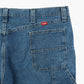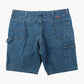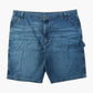 Vintage Wrangler Denim Shorts in Denim. Blue denim carpenter shorts featuring utility pockets, a carpenter loop, reinforced stitching, branded red tab on rear pocket, and sturdy zipper fly; classic Wrangler workwear detailing throughout.