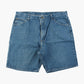 Vintage Wrangler Denim Shorts in Denim. Classic five-pocket styling, leather Wrangler patch at waistband, heavyweight blue denim, belt loops, metal zip fly, embroidered back pockets, contrast stitching.