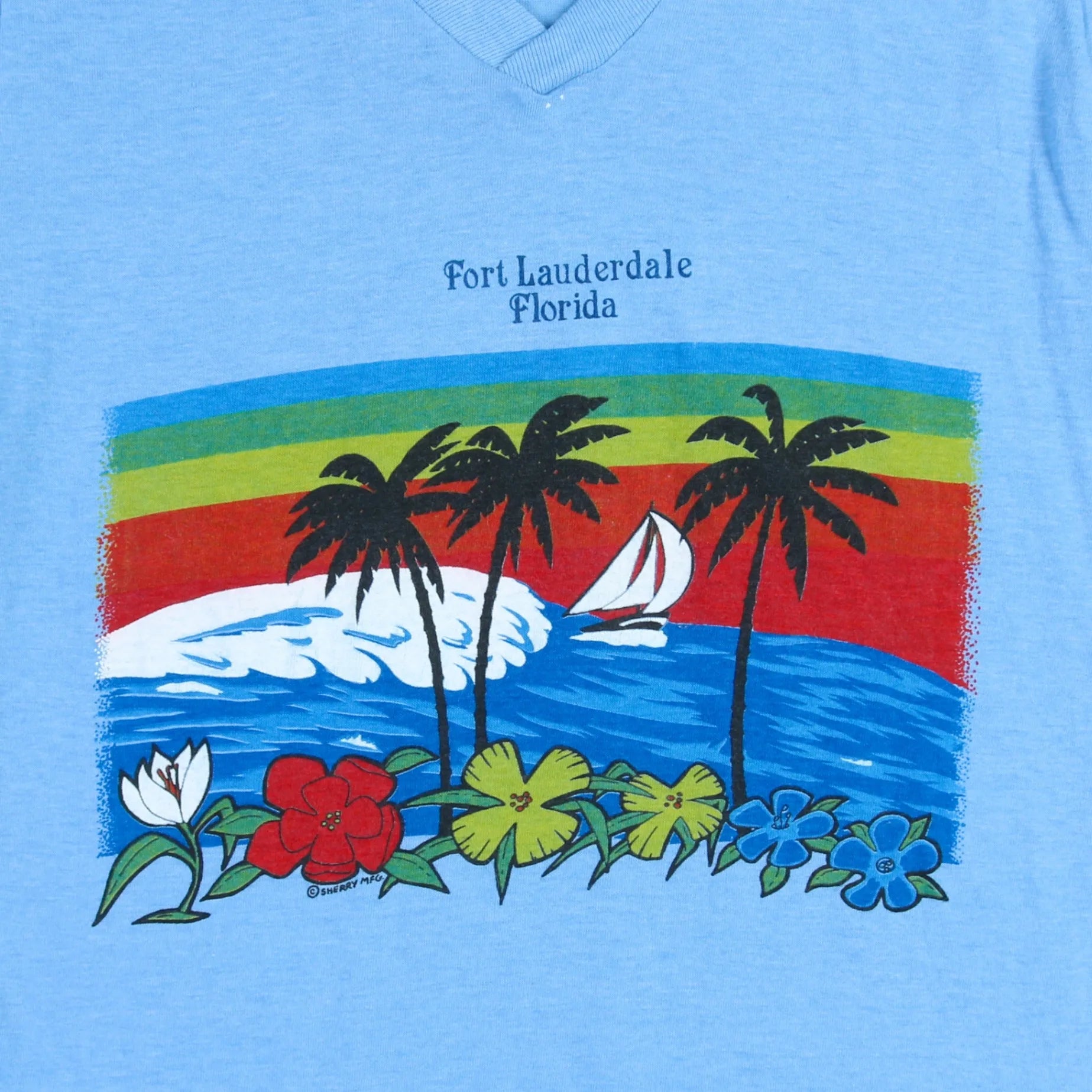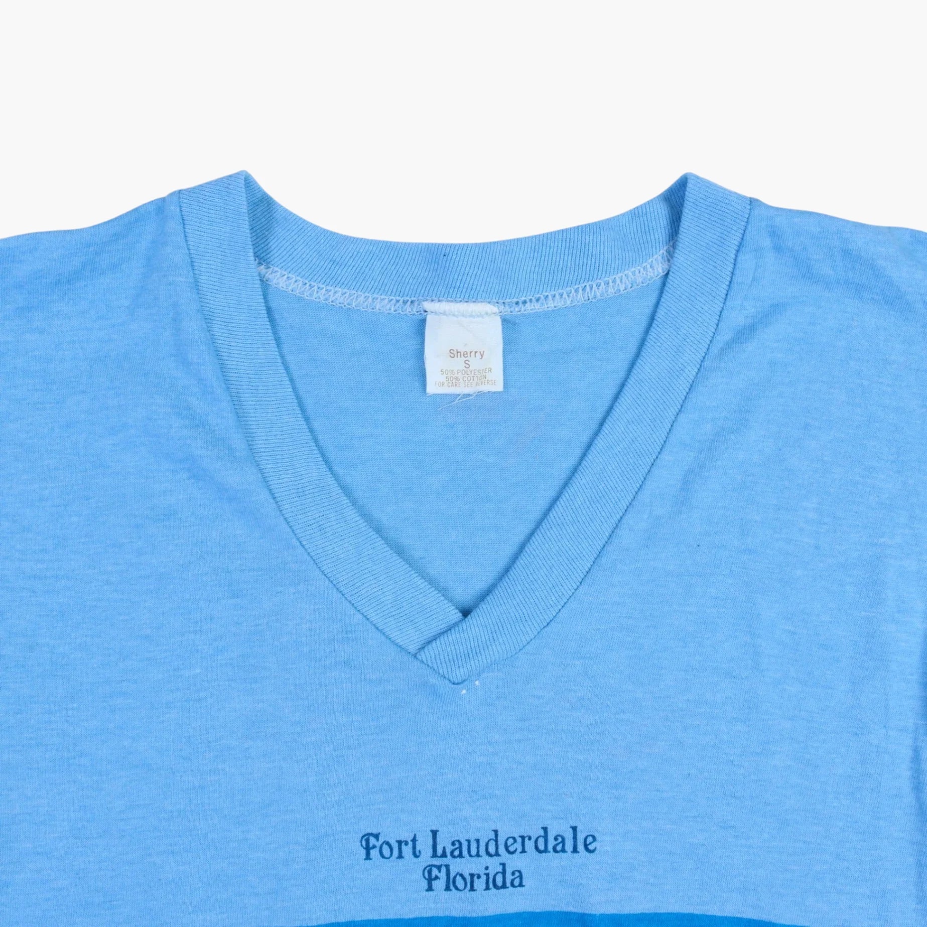 Vintage T-shirt in Blue. Crafted from a soft cotton blend, the tee features a colorful screen-printed graphic showcasing palm trees and a serene sea background, alongside the inscription 'Fort Lauderdale, Florida.'
