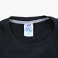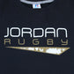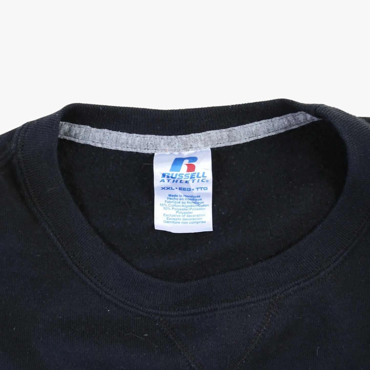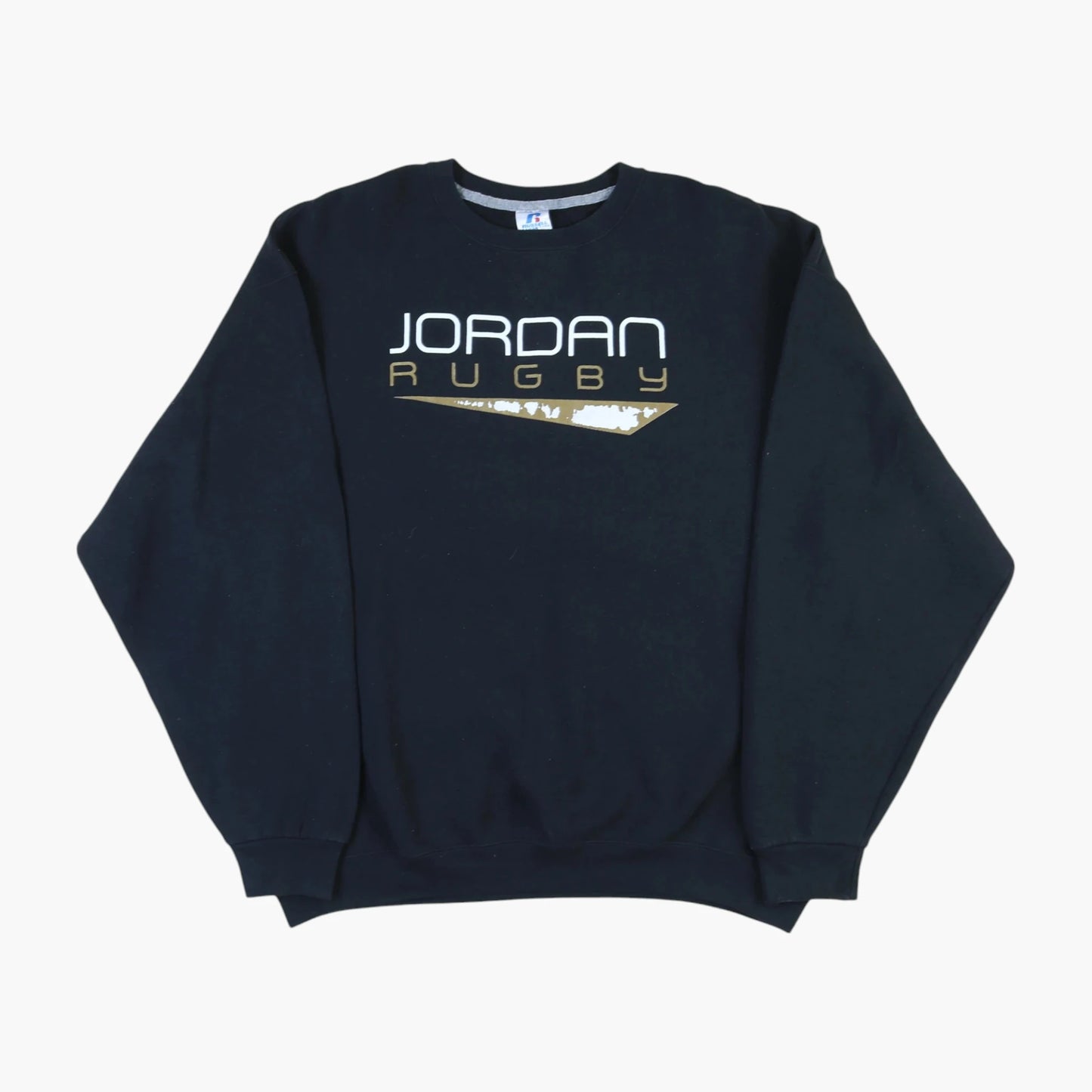 Vintage Russell Athletic Sweatshirt in Black. Black crewneck sweatshirt with a large 'JORDAN RUGBY' print in white and gold on the front, showing natural cracking typical of vintage graphics. Made by Russell Athletic, features ribbed cuffs, collar, and hem. Heavyweight fleece lining.