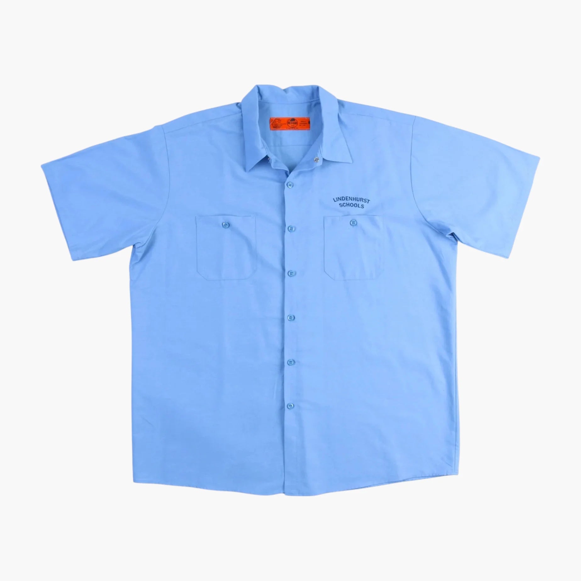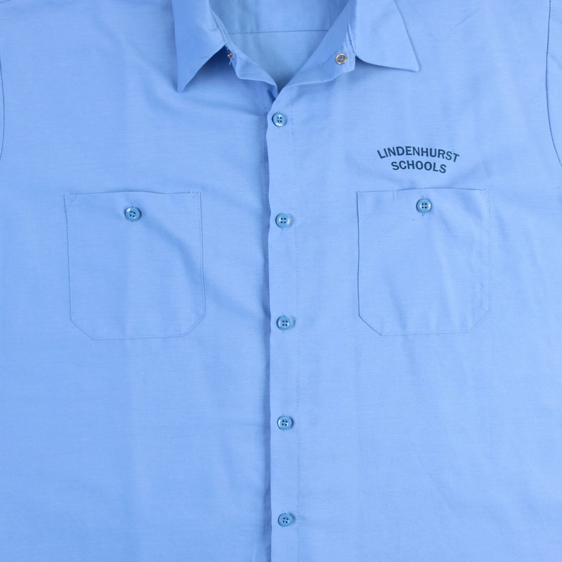 Vintage Garage Shirt Short-sleeve Button-up Shirt in Blue. Short-sleeve light blue shirt with embroidered 'Lindenhurst Schools,' dual chest pockets, front button closure, and a collar with an additional snap clasp.