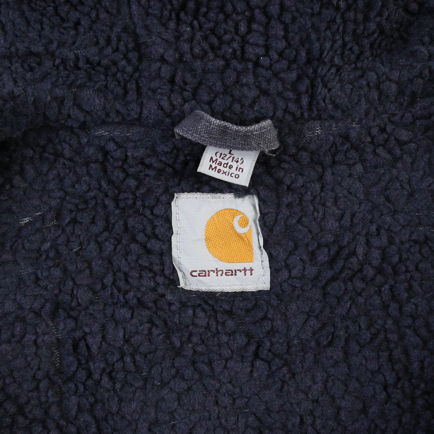 Vintage Carhartt Hooded Vest in purple. Sherpa fleece lined, snap buttons, sleeveless cut, dual front pockets, Carhartt logo patch, rugged blue washed canvas, fixed hood.