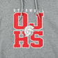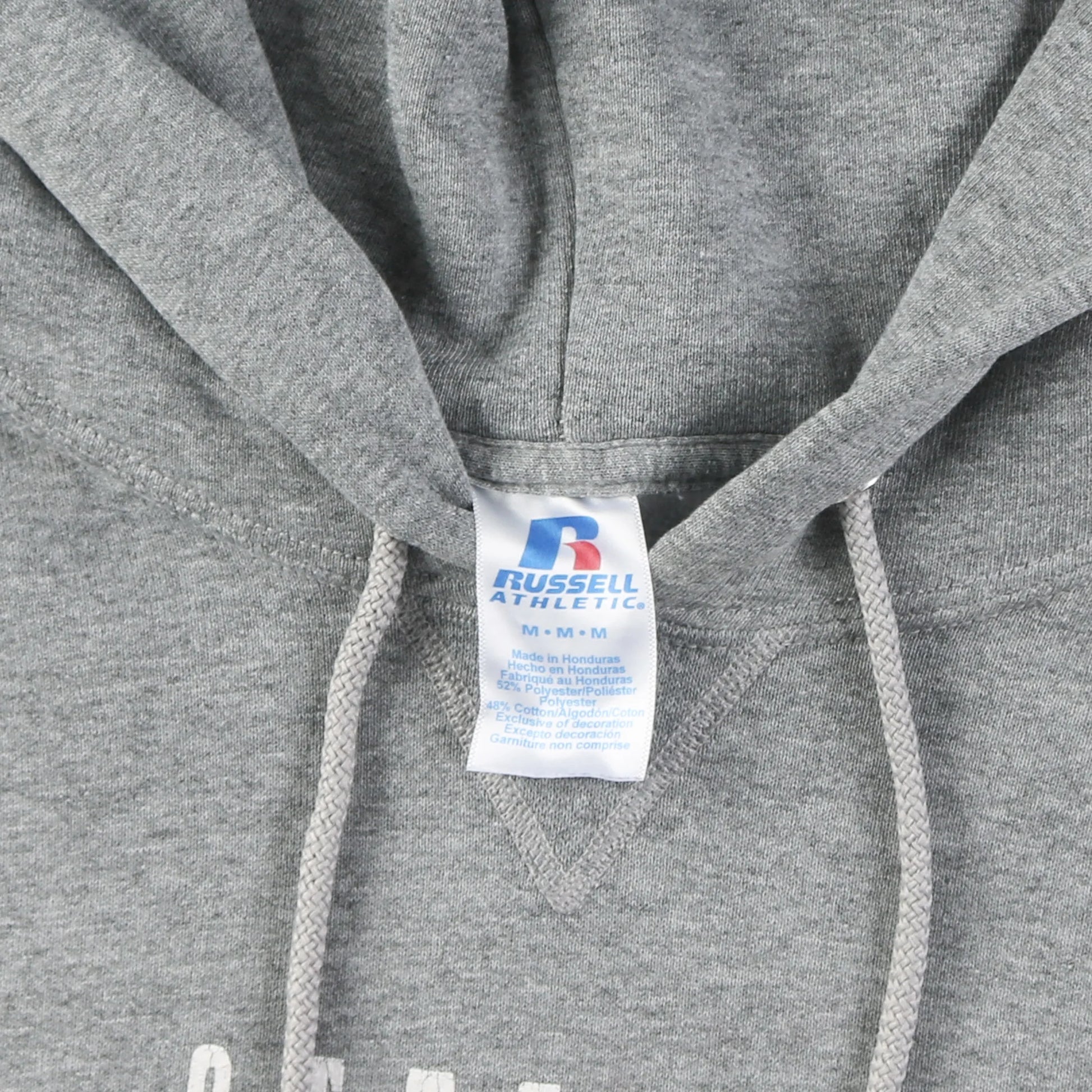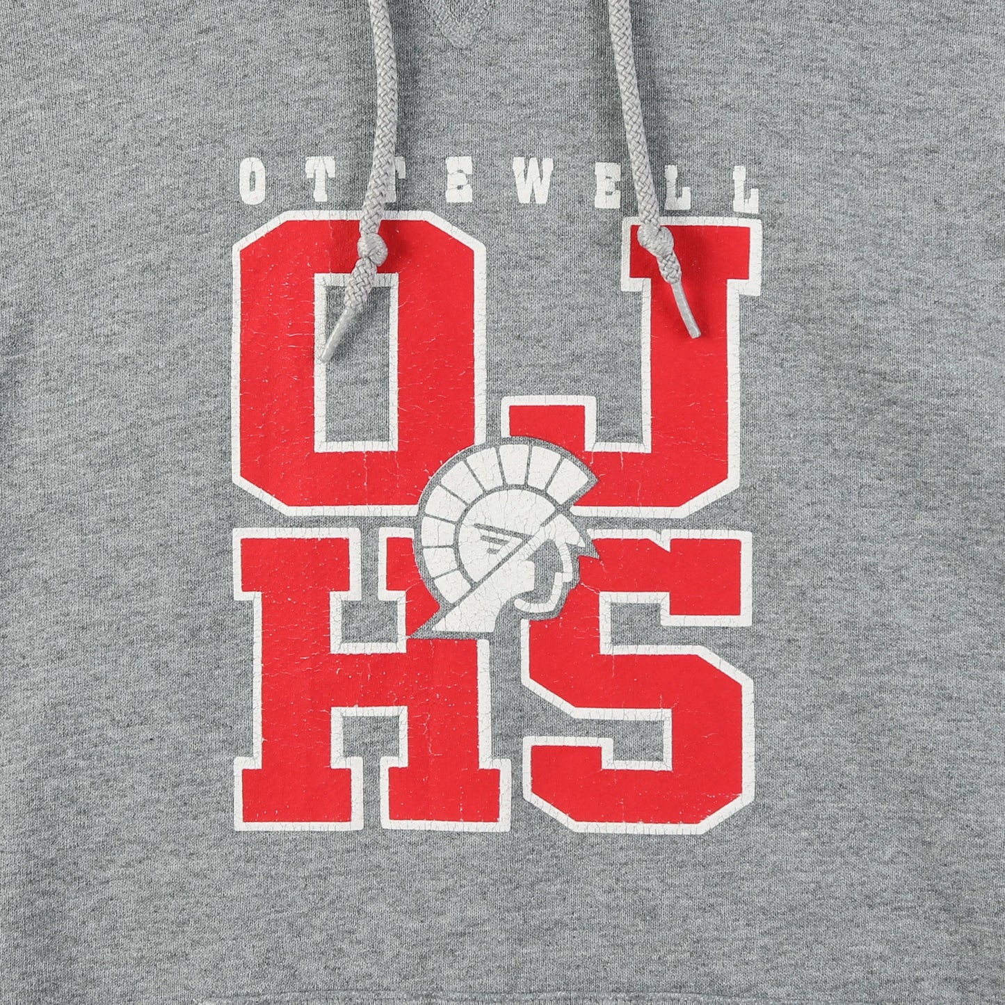 Vintage Russell Athletic Hoodie in Grey. Gray fleece hoodie with large collegiate red and white "OTTEWELL OJHS" graphic, spartan helmet logo, ribbed cuffs and hem, kangaroo pocket, drawstring hood, and Russell Athletic logo on hem and inside label.