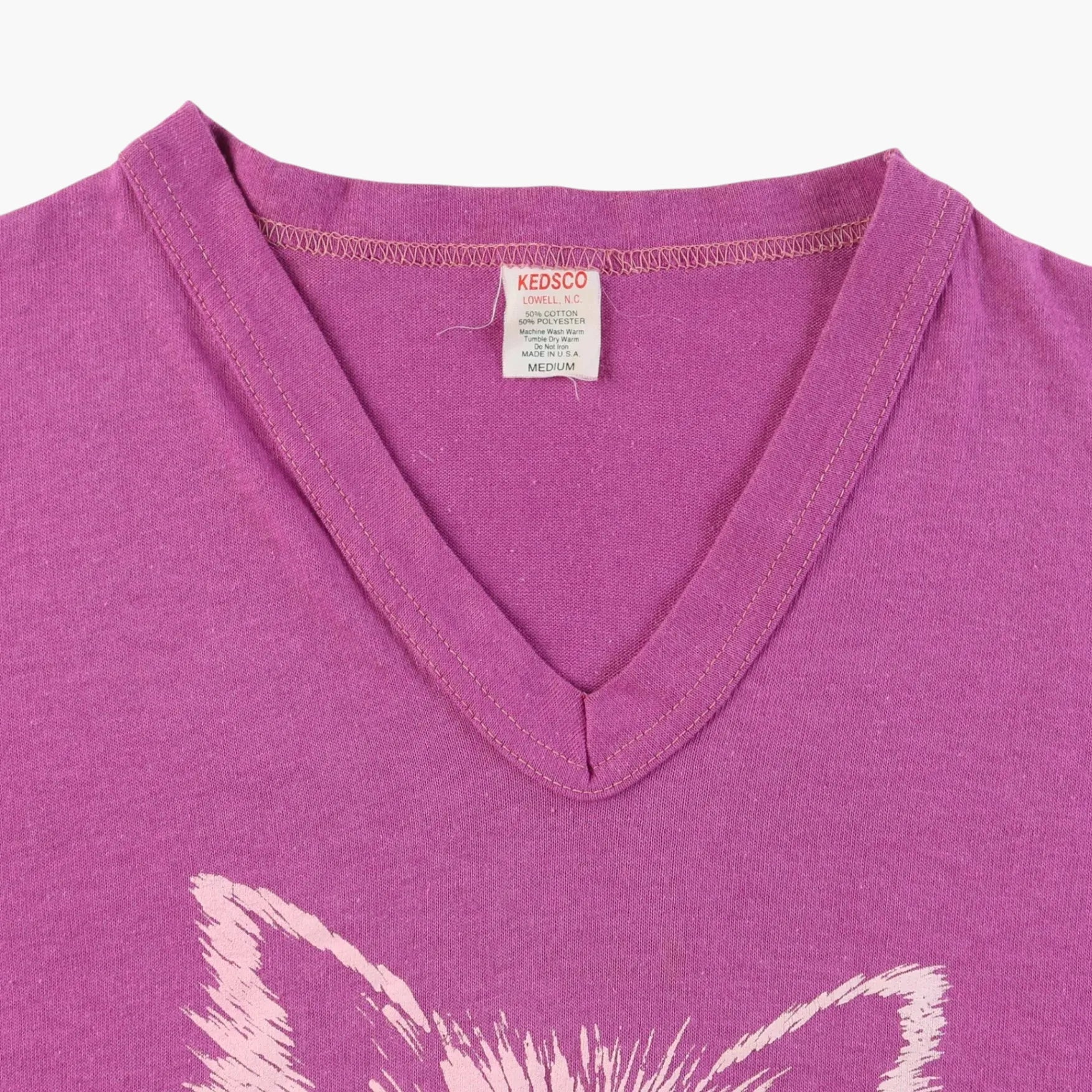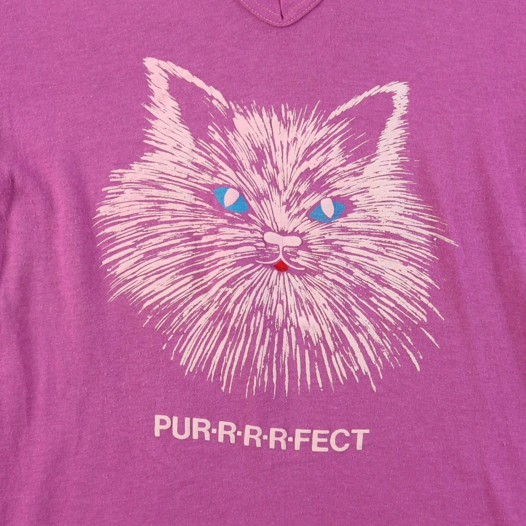 Vintage T-shirt in Purple. The garment is made of soft cotton, and the graphic shows a stylized cat with unique blue-shaded eyes.