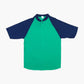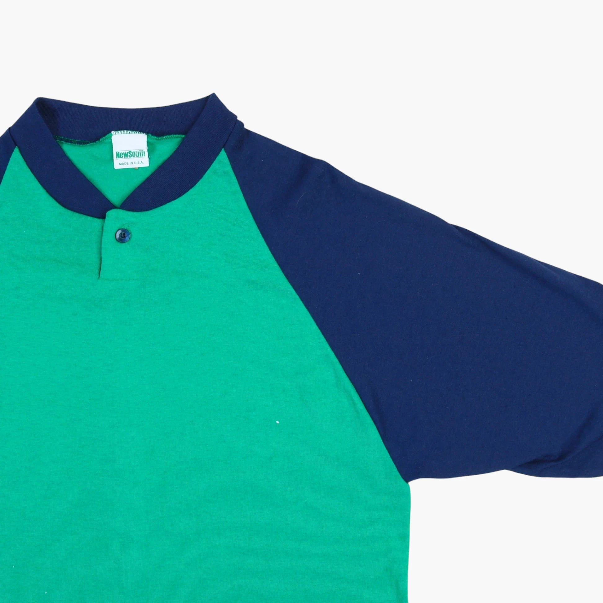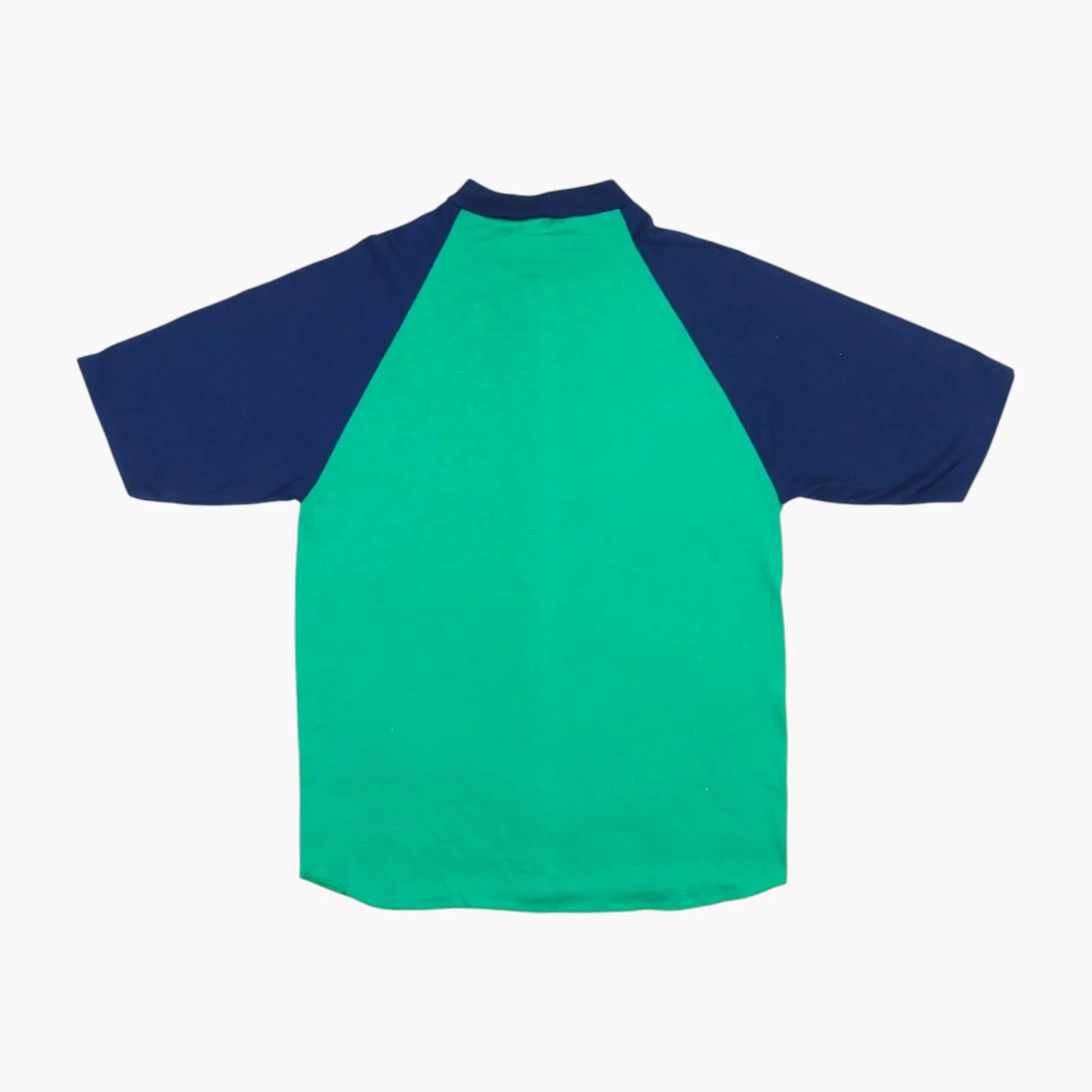 Vintage Vintage T-Shirts Shirt in Green. Two-tone green with navy raglan sleeves, buttoned collar, and soft cotton material.