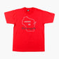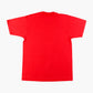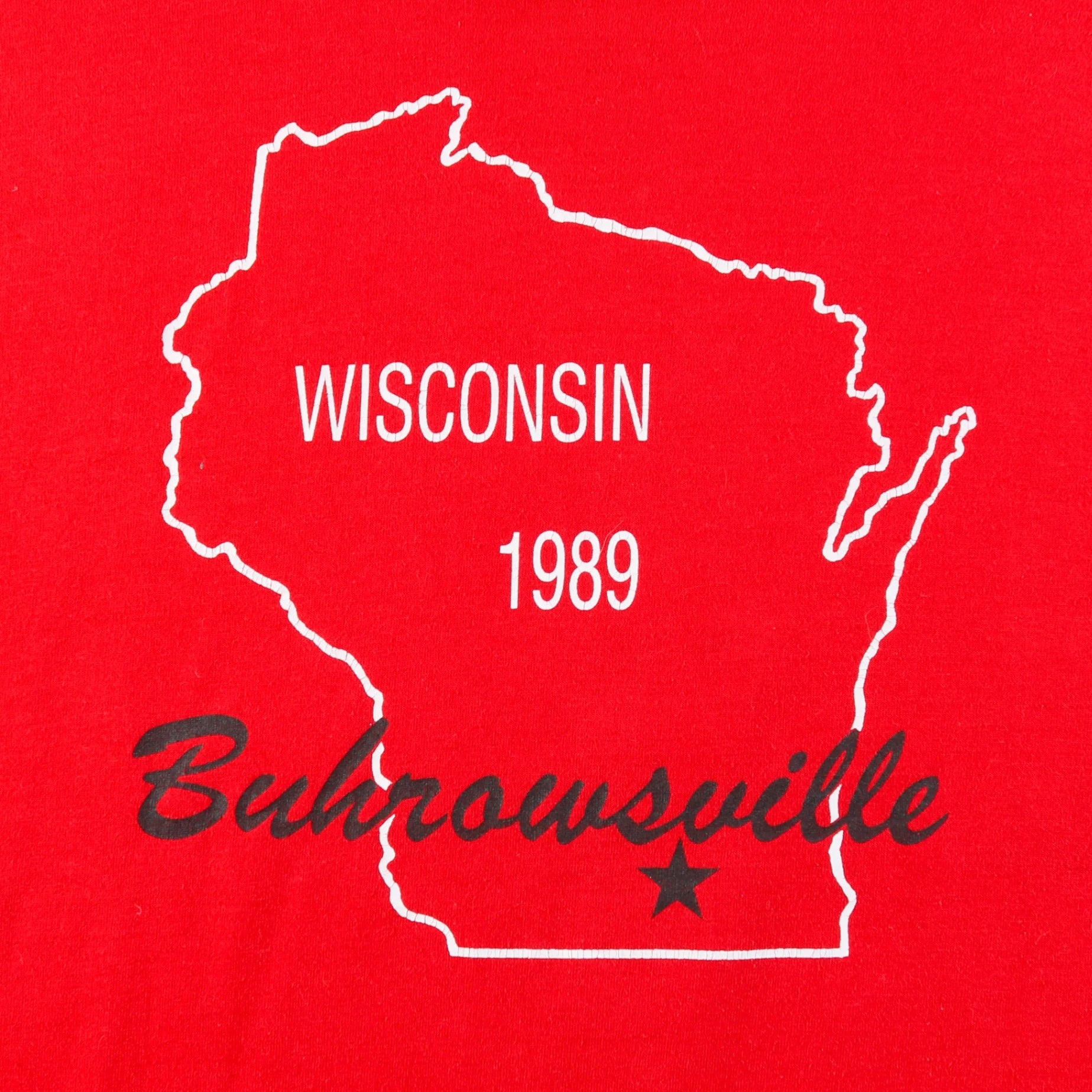 Vintage Vintage T-Shirts T-shirt in Red. Red t-shirt with a Wisconsin state outline, printed text '1989 Buhrowsville', and star detail. Fabric is a cotton-polyester blend.