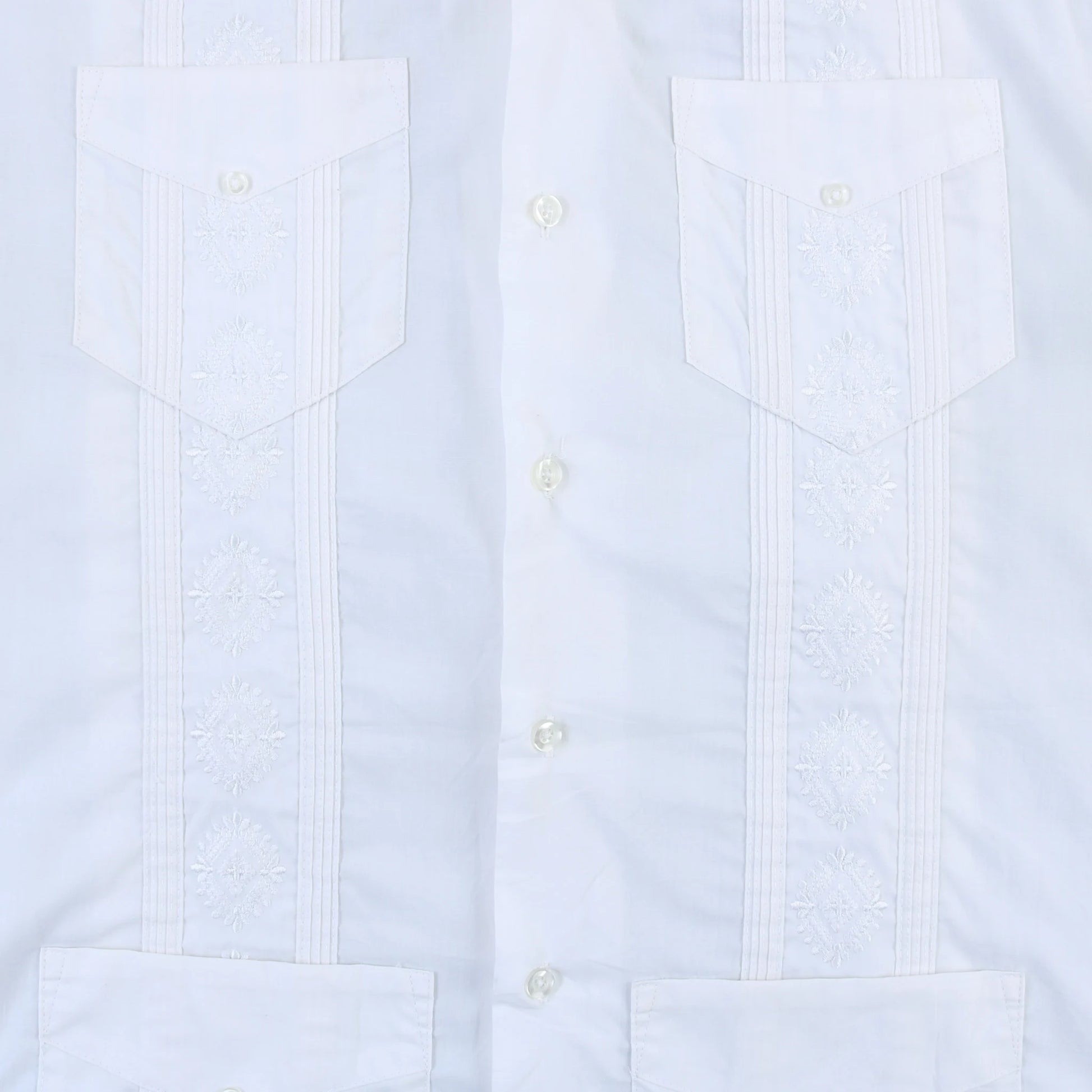 Vintage Vintage Cuban Guayabera Shirts Shirt in White. Traditional short-sleeve guayabera in white with vertical embroidery panels, two front chest pockets, and button closure.