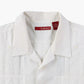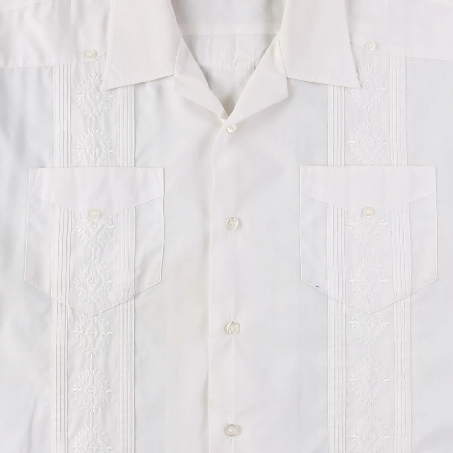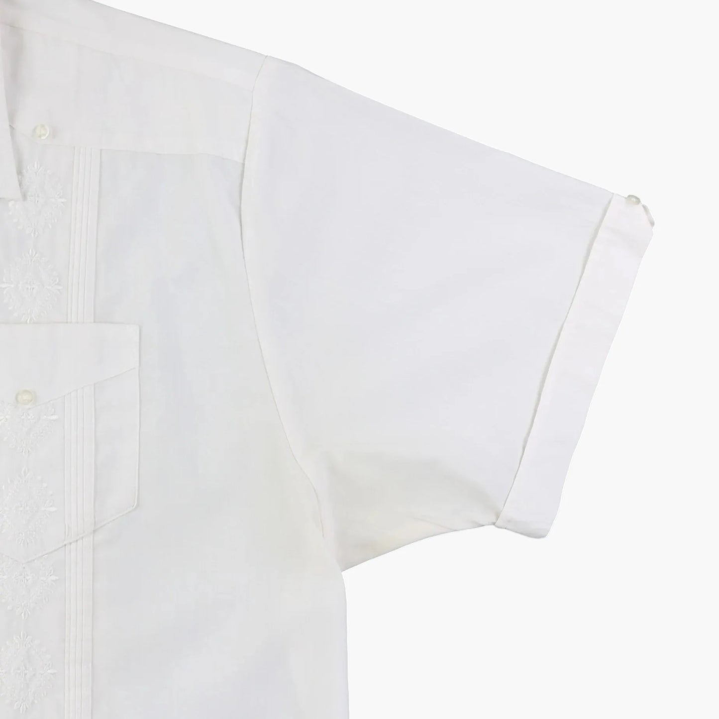 Vintage Cuban Guayabera Shirt in White. This piece showcases traditional embroidered detailing, characteristic pleated panels, and lightweight fabric. Perfect for warm weather attire or cultural celebrations, combining comfort and sophistication.
