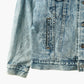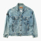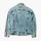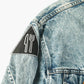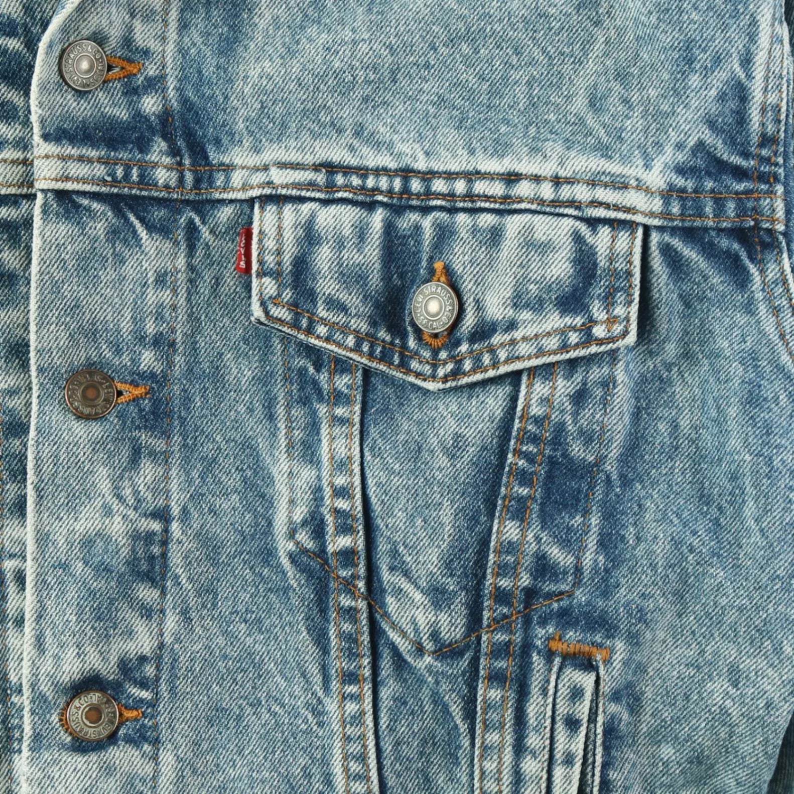 Vintage Levi's Jacket in Blue. Iconic Levi's light blue denim jacket with a faded effect; has a label tag, metal buttons, and a black patch with cutlery symbols.