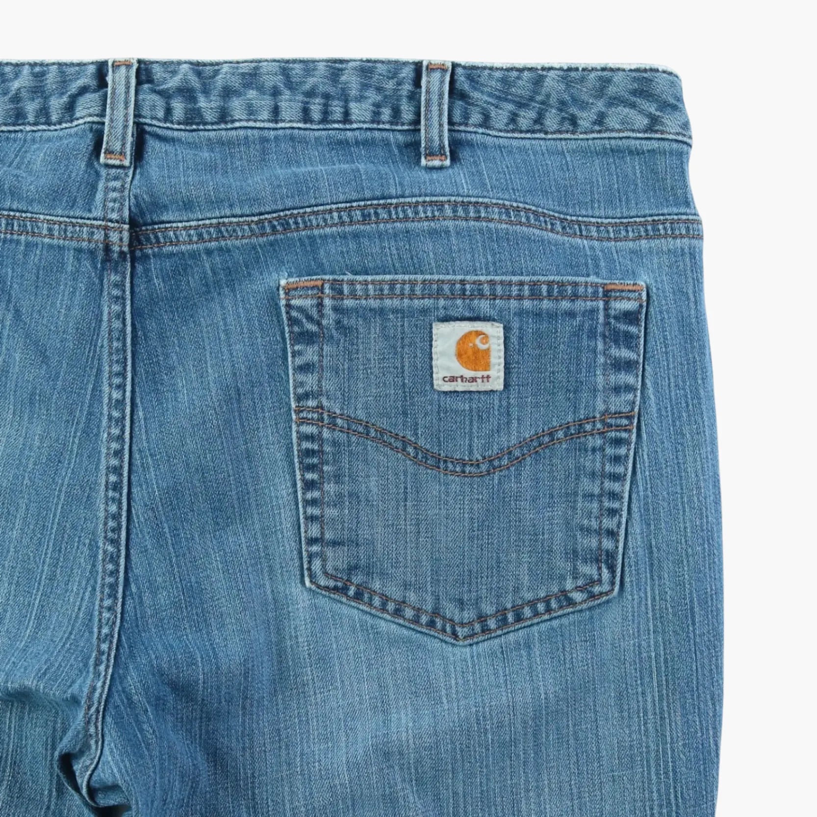 Vintage Carhartt Jeans in Denim. Medium wash denim, five-pocket design, Carhartt logo on back pocket.