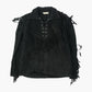 Vintage Western Shirt in Black. Black suede fringe shirt with lace-up front, large pointed collar, and extensive fringe on front, back, and sleeves. Western style with lace-up placket and tie details at the sleeves.