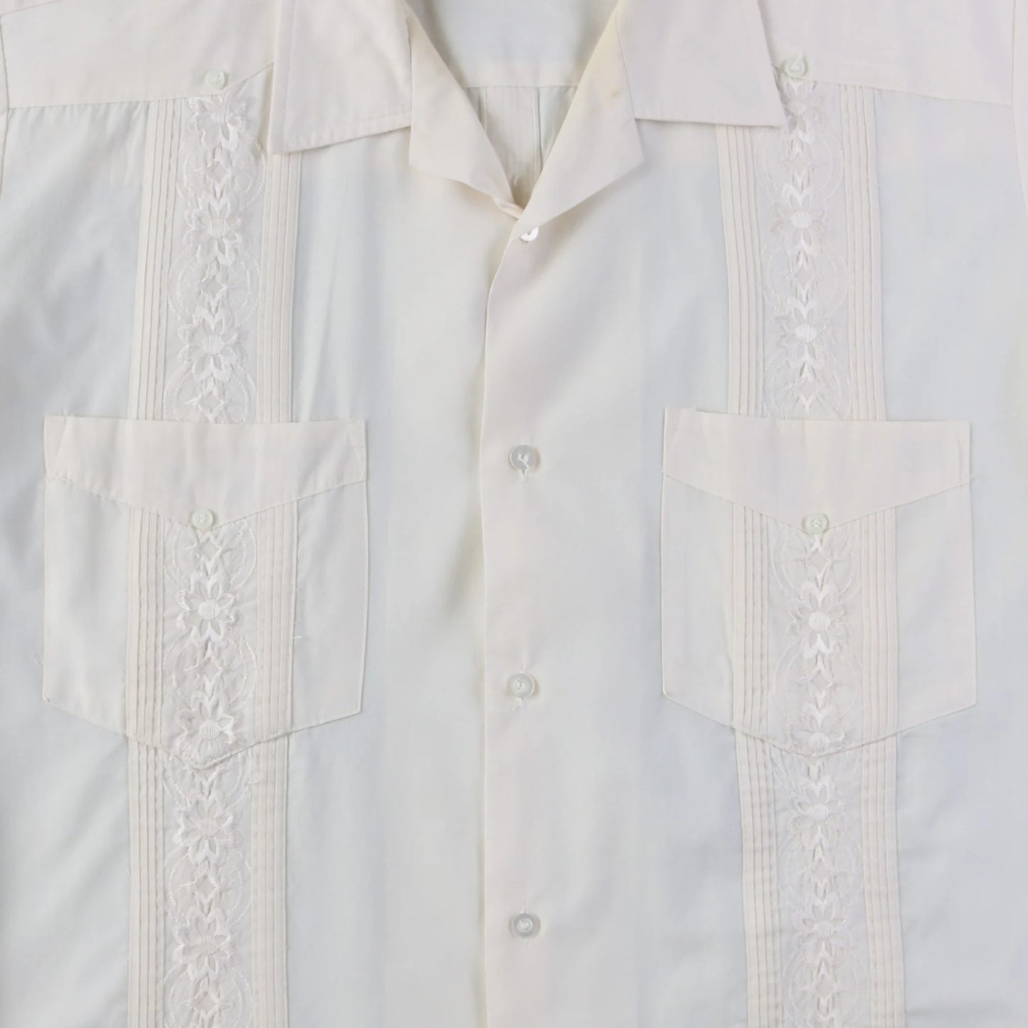 Vintage Cuban Guayabera Shirt in White. This Guayabera shirt showcases the classic design with embroidered pleats running down the chest, double chest and bottom pockets, short sleeves, and a lightweight fabric ideal for warm weather.