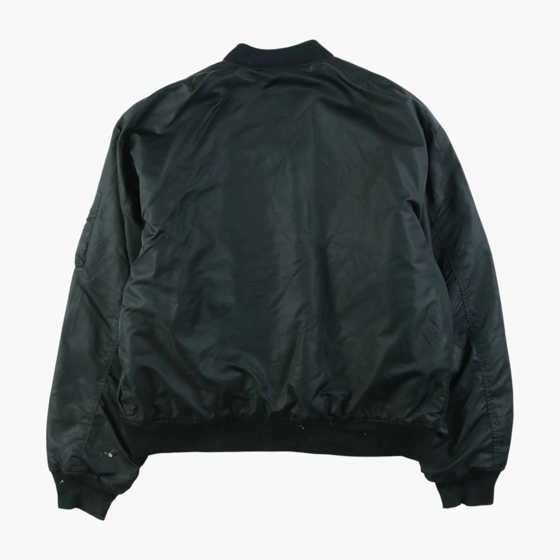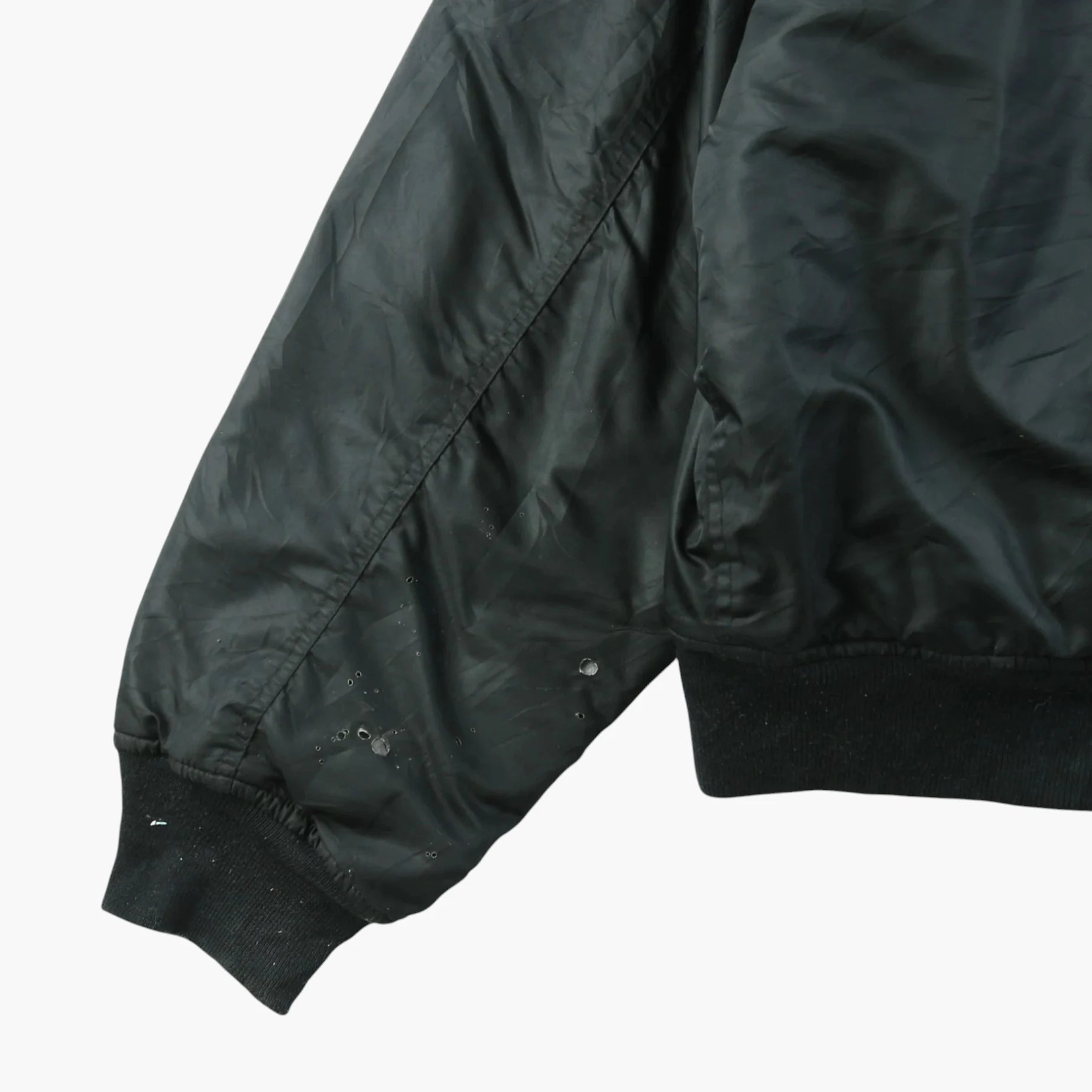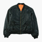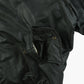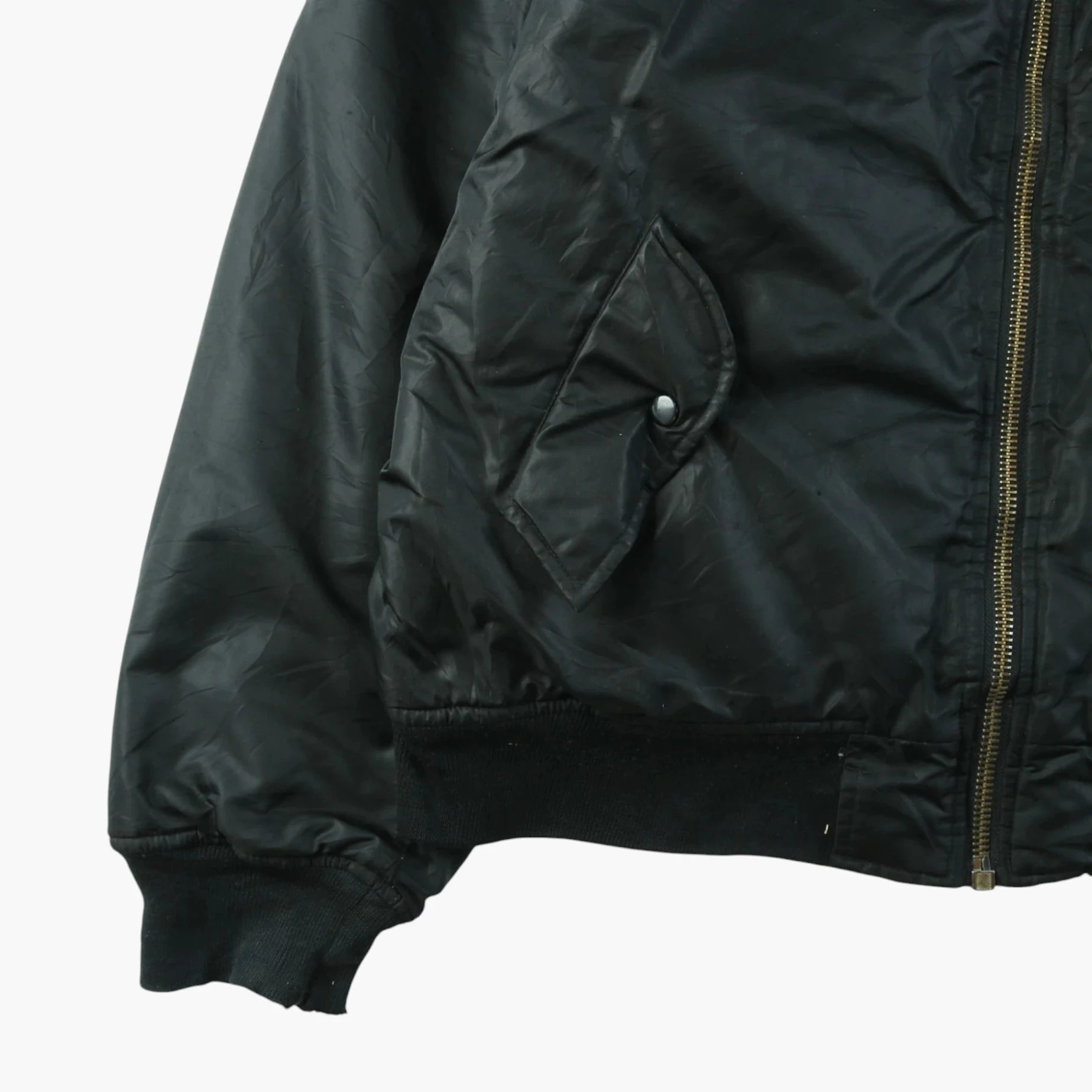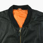 Vintage Bomber Jacket in Black. Classic black bomber jacket with an orange lining. Features front snap-secure pockets, ribbed cuffs and hem, and a zipper pocket on the sleeve.