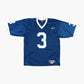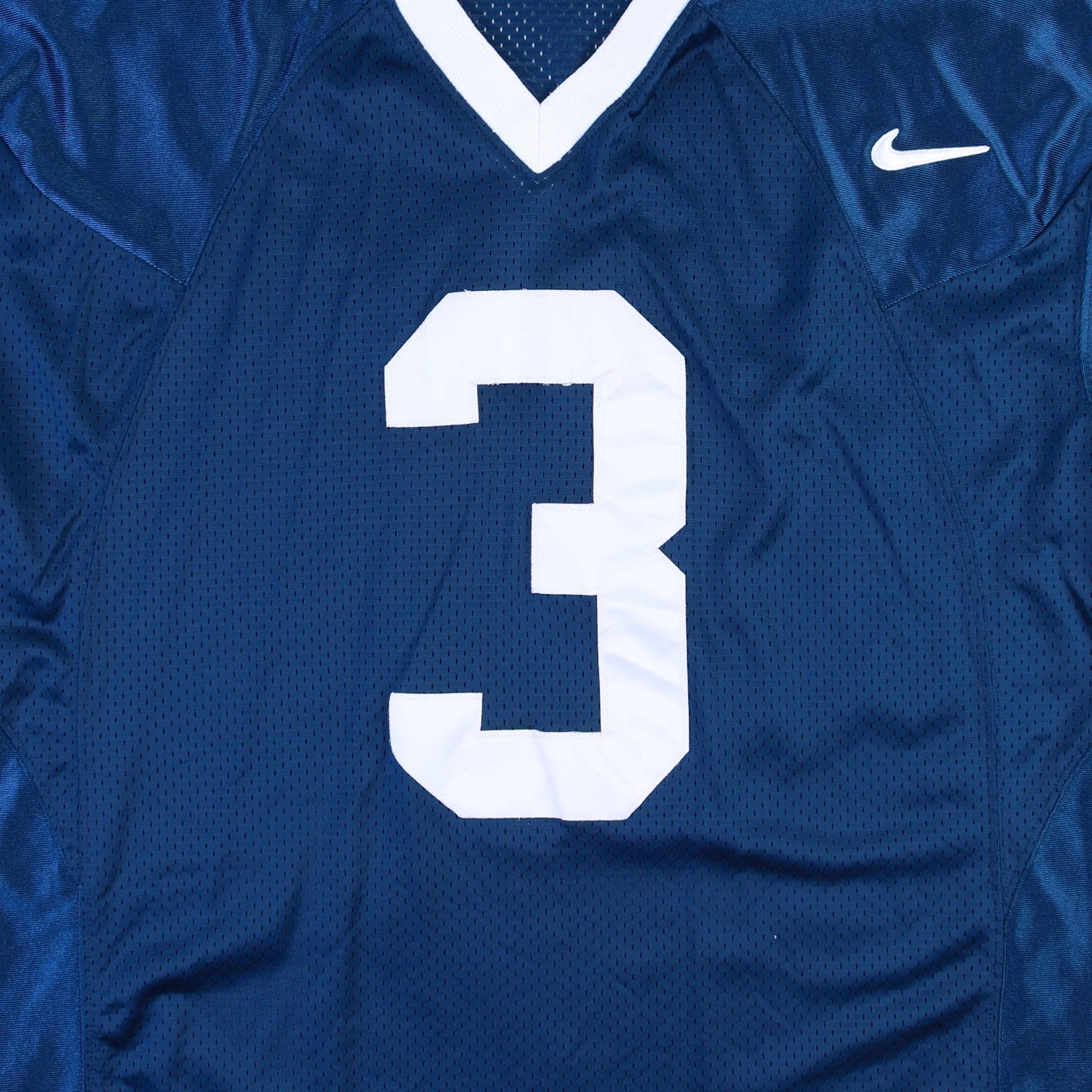 Vintage NFL Jersey in Blue. Deep blue mesh jersey with large white "3" front/back, white V-neck/sleeves, Nike Swoosh on chest, and jersey numbering on sleeves. Made from shiny, athletic mesh polyester with Nike Team "Authentic" patch at the hem and size M/LENGTH +2 label.