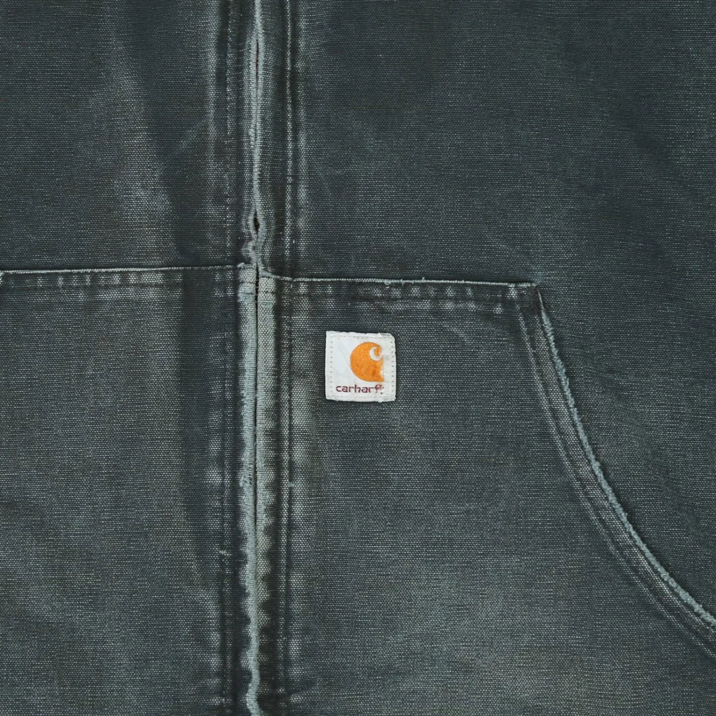 Vintage Carhartt Jacket in Black. Faded black exterior, distressed at sleeve edges, quilted interior lining, zip-up closure, ribbed cuffs and waistband.