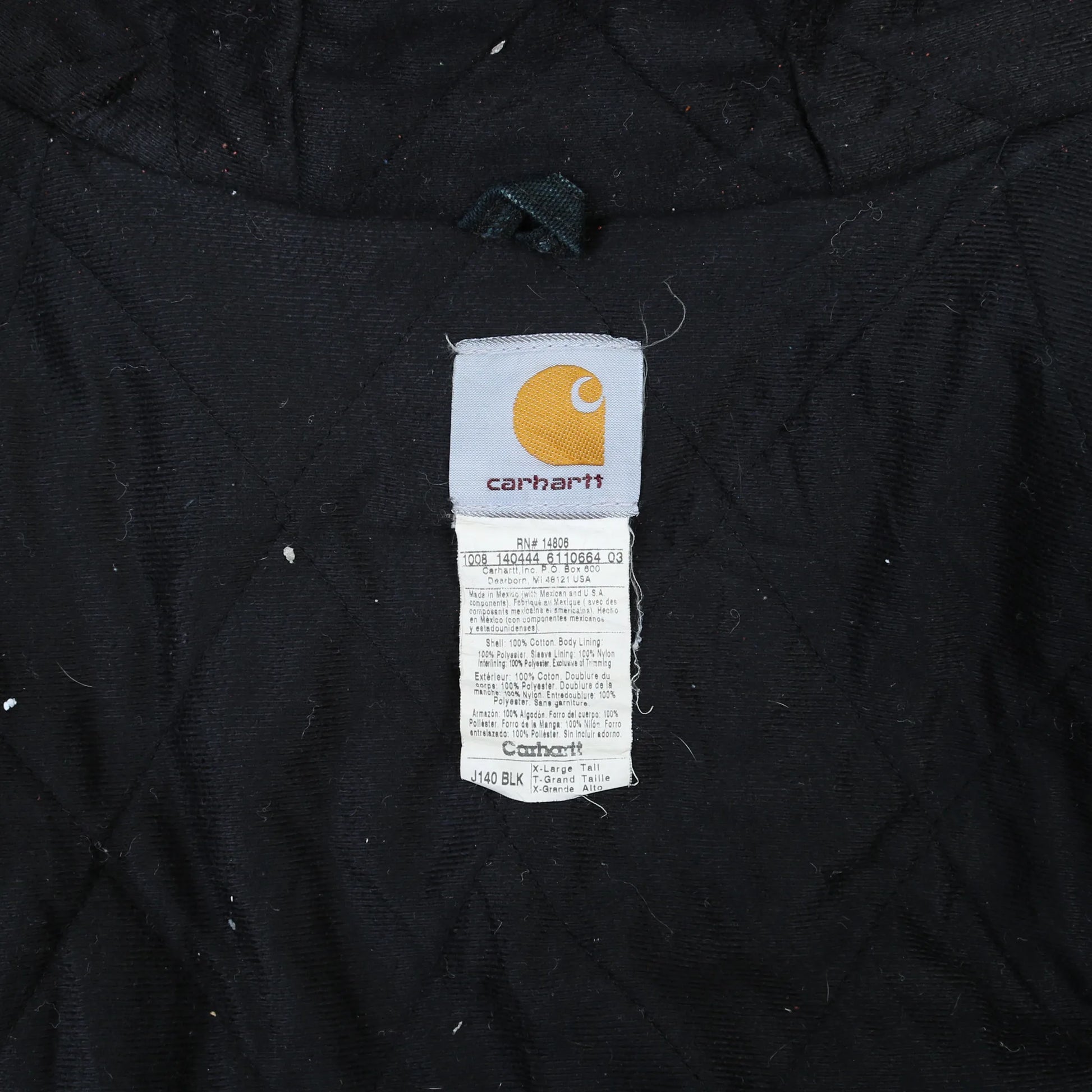 Vintage Carhartt Hooded Work Jacket in Black. Faded green canvas hooded zip jacket with ribbed cuffs and hem, kangaroo pockets, and visible Carhartt logo patch on the pocket. Garment shows natural distressing and a washed finish for a true vintage effect.