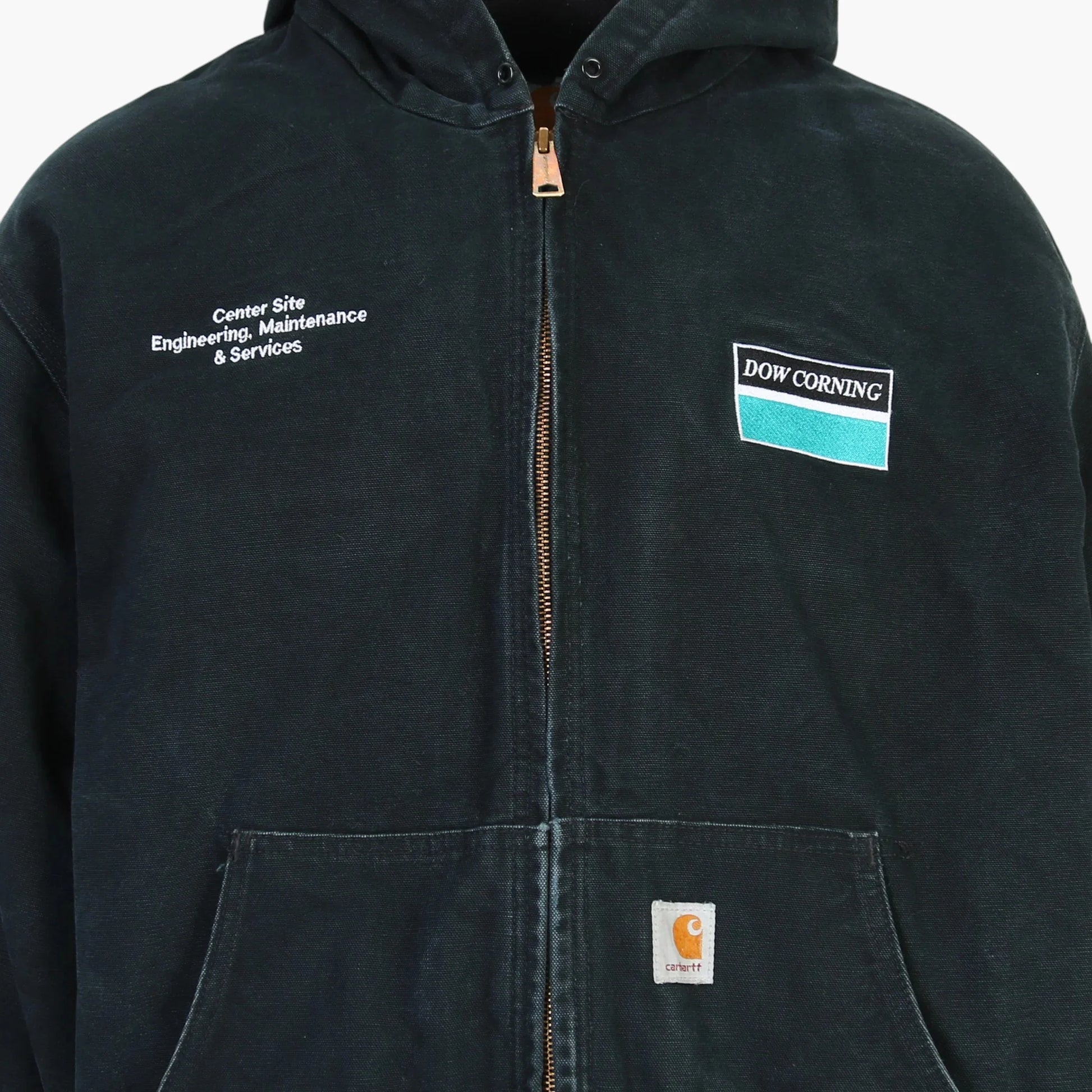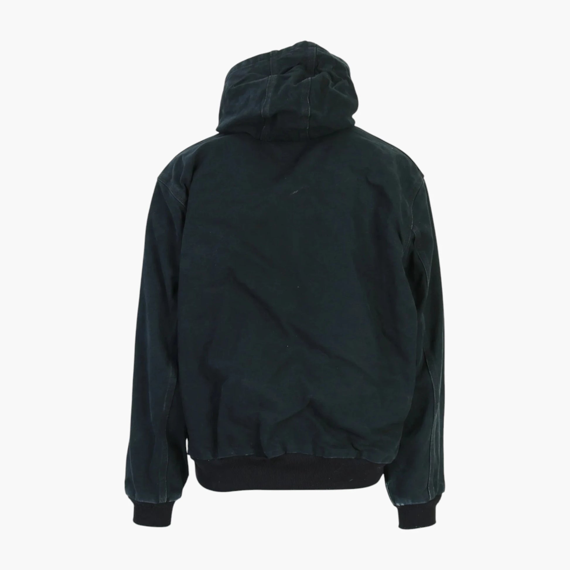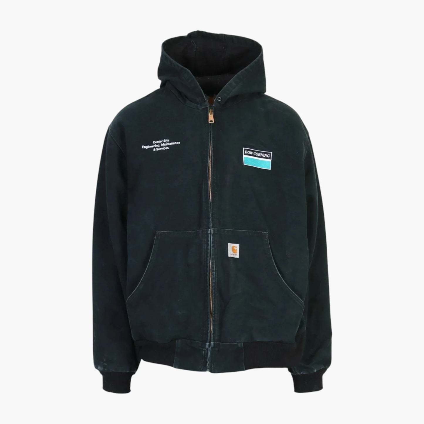 Vintage Carhartt Hooded Work Jacket in Black. Black canvas shell, white company embroidery, teal patch on left chest, ribbed hem and cuffs, front zip, split pockets, hooded collar, Carhartt logo patch above waistband.