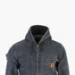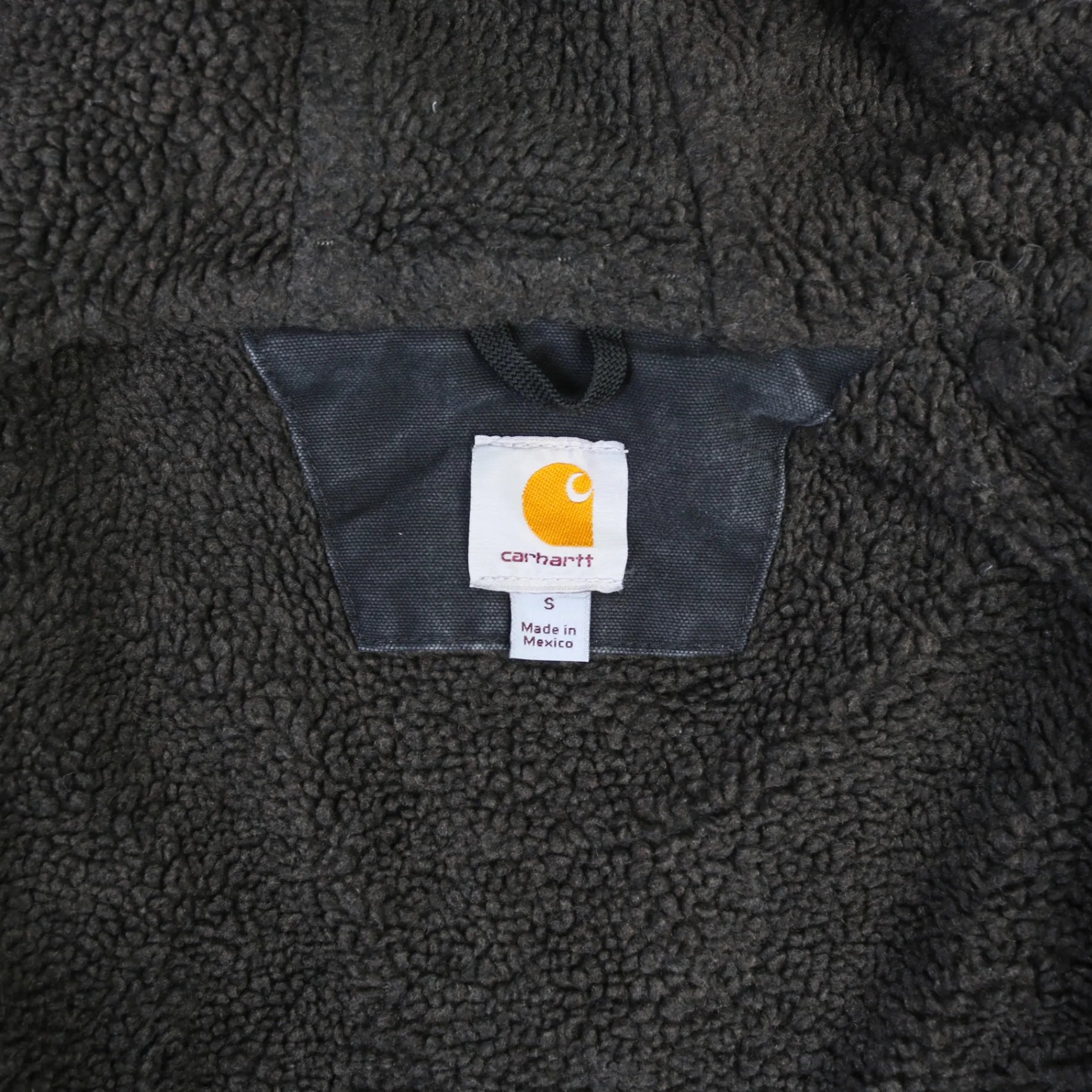 Vintage Carhartt Hoodie in Black. Charcoal gray distressed hoodie with visible wear and tear, features brown Carhartt branding and interior Sherpa lining.