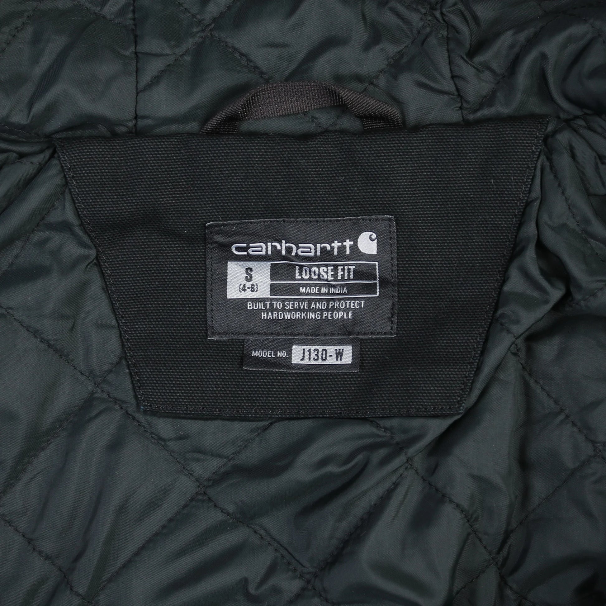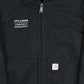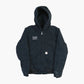 Vintage Carhartt Hooded Work Jacket in Black. Black Carhartt hooded work jacket with "City of Boise Community Engagement" left chest embroidery, front zip, quilted lining, two hand pockets, ribbed cuffs and hem.
