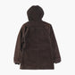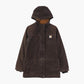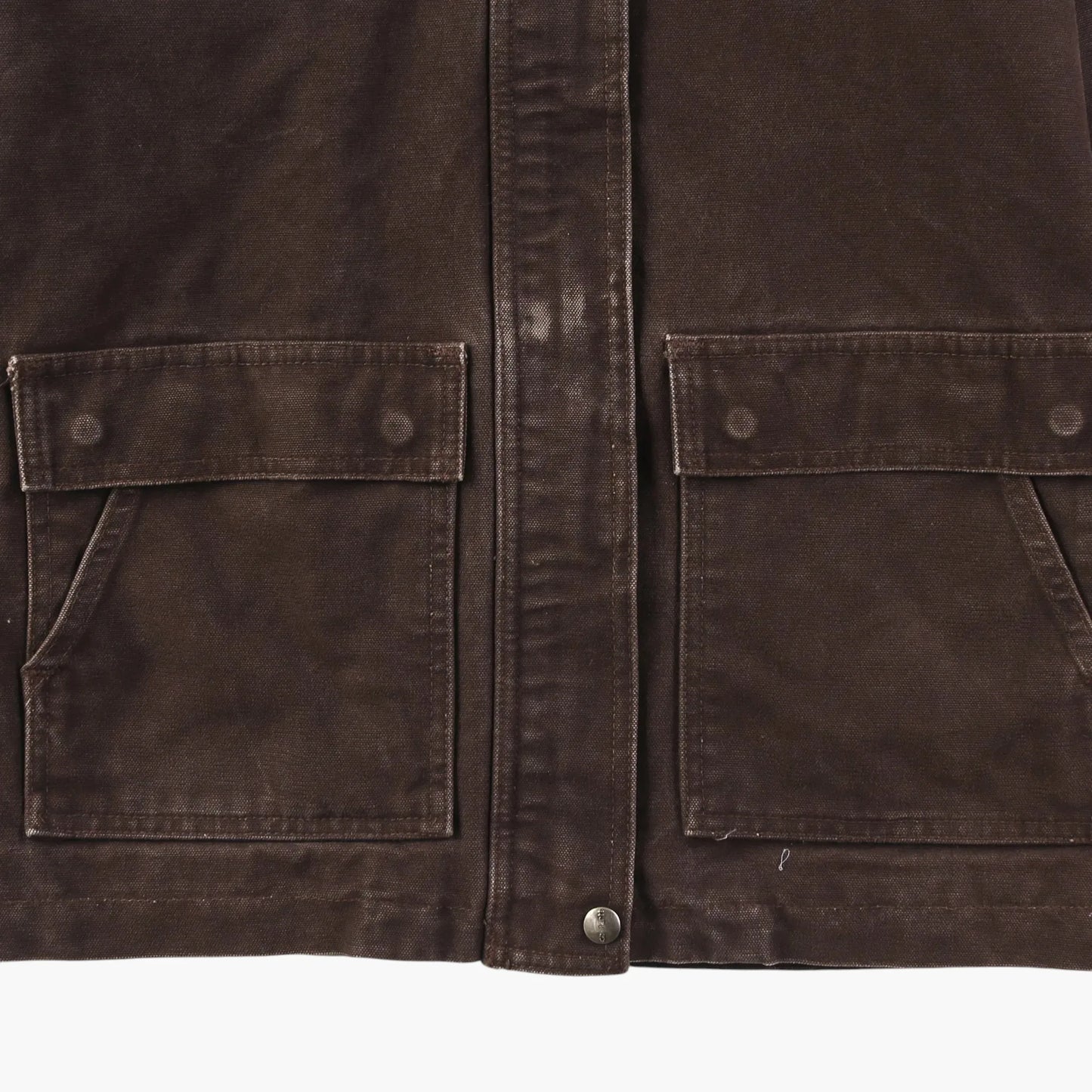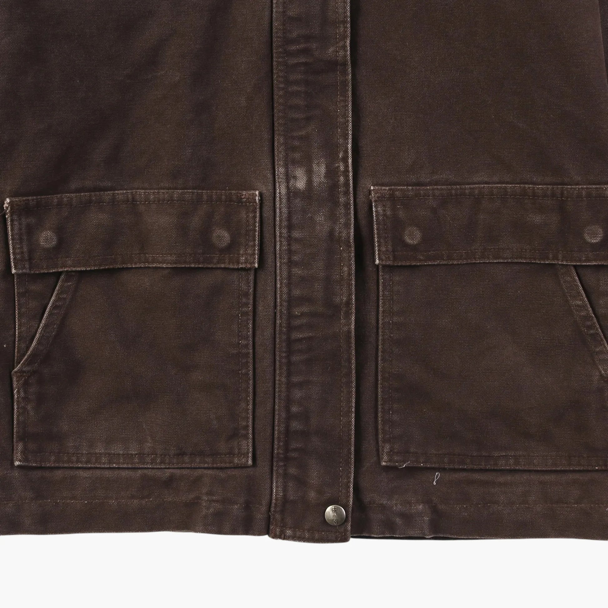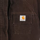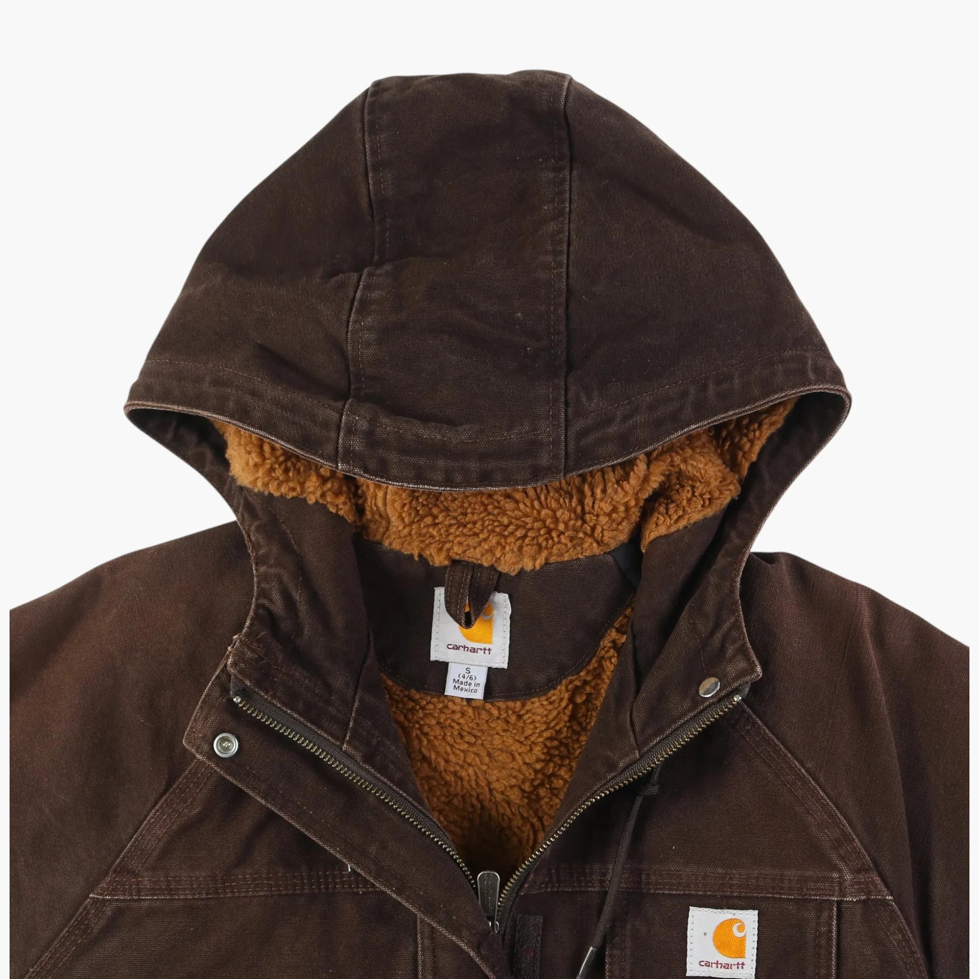 Vintage Carhartt Hooded Chore Coat in Brown. Heavy brown canvas exterior, faux-shearling lining, Carhartt chest logo patch, snap-closure front pockets, drawstring hood, visible reinforced seams, zipper closure.