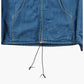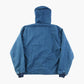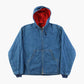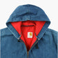 Vintage Carhartt Hooded Denim Jacket in Denim. Denim jacket with a bright red inner lining, blue sleeves, hood with drawstring, front zipper, drawstring hem, and front pockets.
