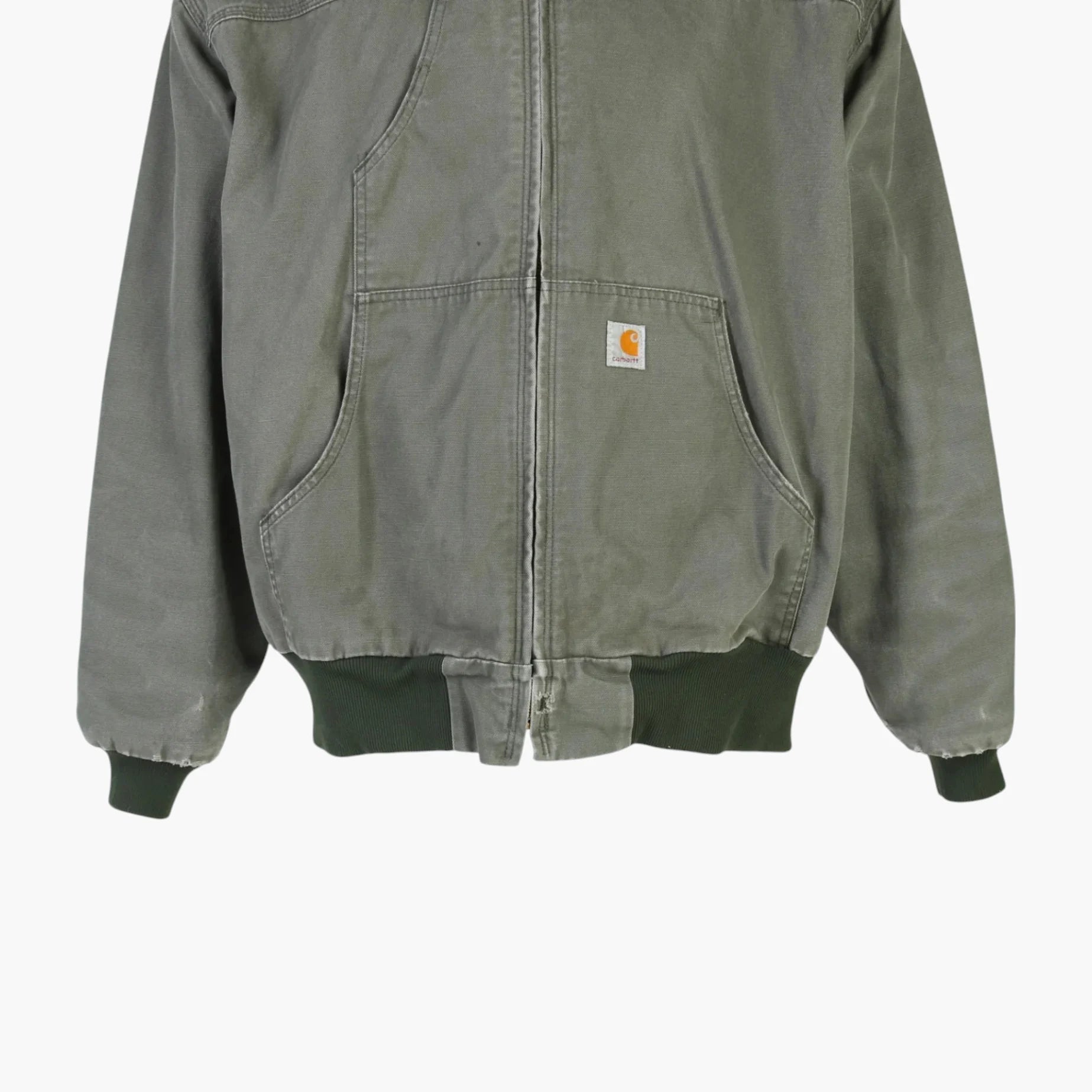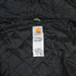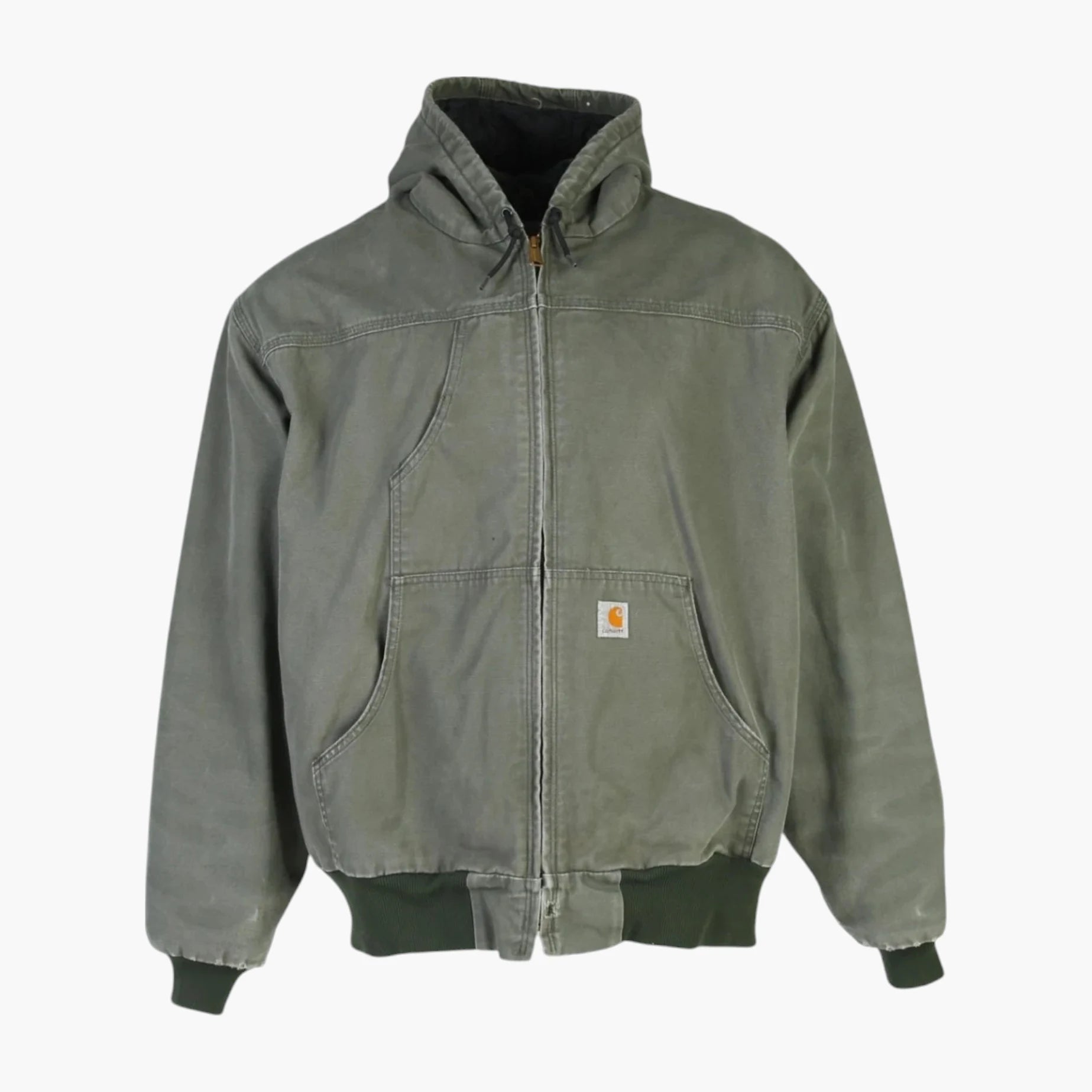 Carhartt, established in 1889, specializes in workwear renowned for its durability and functionality. This jacket, a classic hooded style made from green tough-wearing fabric, appeals to outdoor enthusiasts and style-conscious individuals. Modern wearers appreciate these garments for both their utility and their presence in streetwear culture. Collectors often value vintage Carhartt items for their quality workmanship and distinctive branding. This piece offers a retro look while maintaining practicality.