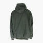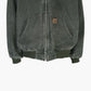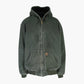 Vintage Carhartt Hooded Jacket in Green. Faded olive green full zip hooded jacket with classic Carhartt patch on pocket, ribbed cuffs and hem, and a thermal lining. Features visibly worn edges and vintage wash.