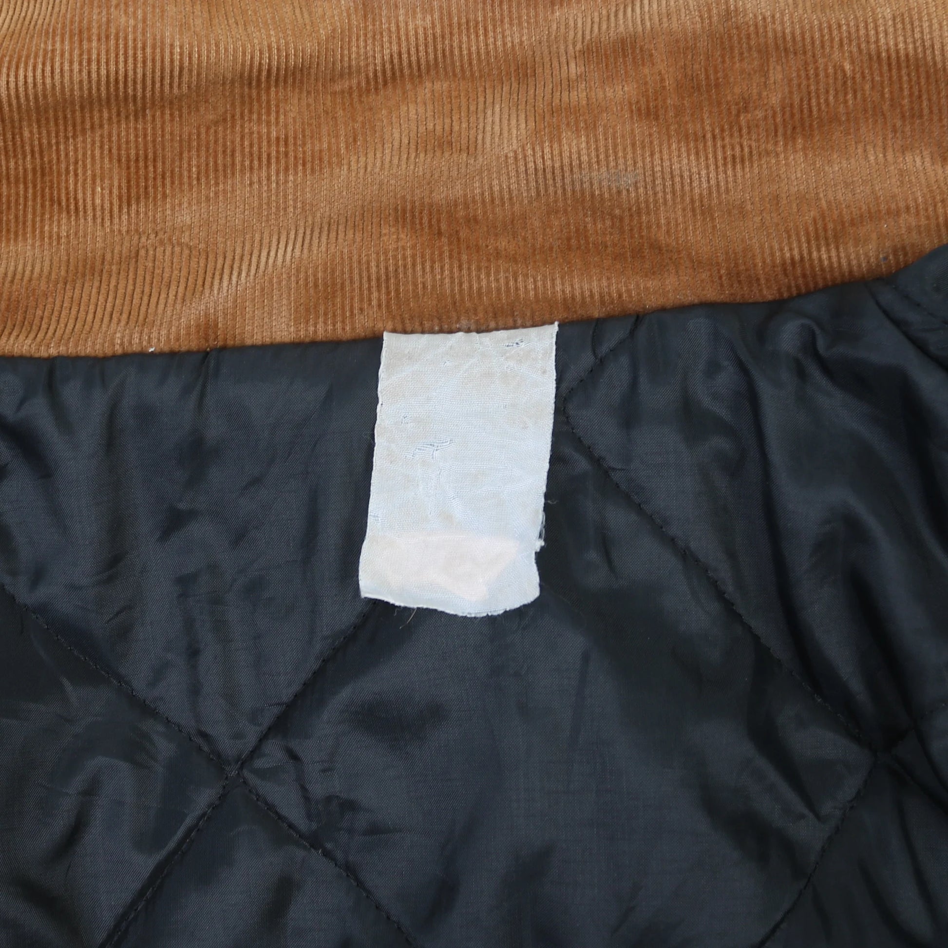 Vintage Carhartt Jacket in Hamilton Brown. Beige canvas body, brown contrasting corduroy collar, two flap chest pockets, Carhartt label patch, ribbed knit cuffs, workwear styling, visible wear typical for Carhartt's rugged outerwear.