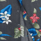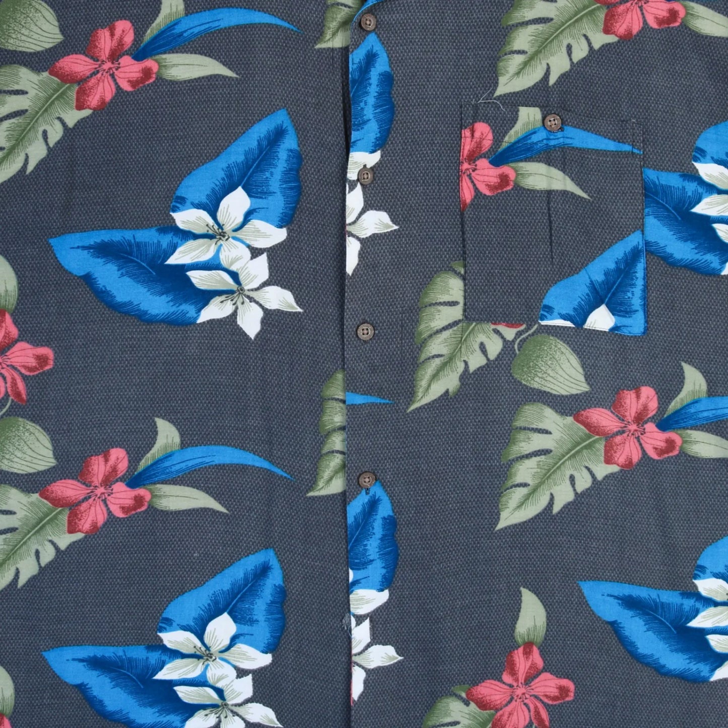 Vintage Hawaiian Aloha Button-up Shirt in multicoloured . This piece is made of lightweight fabric with a textured weave. It showcases a vibrant floral print with tropical leaves and contrasting tones.