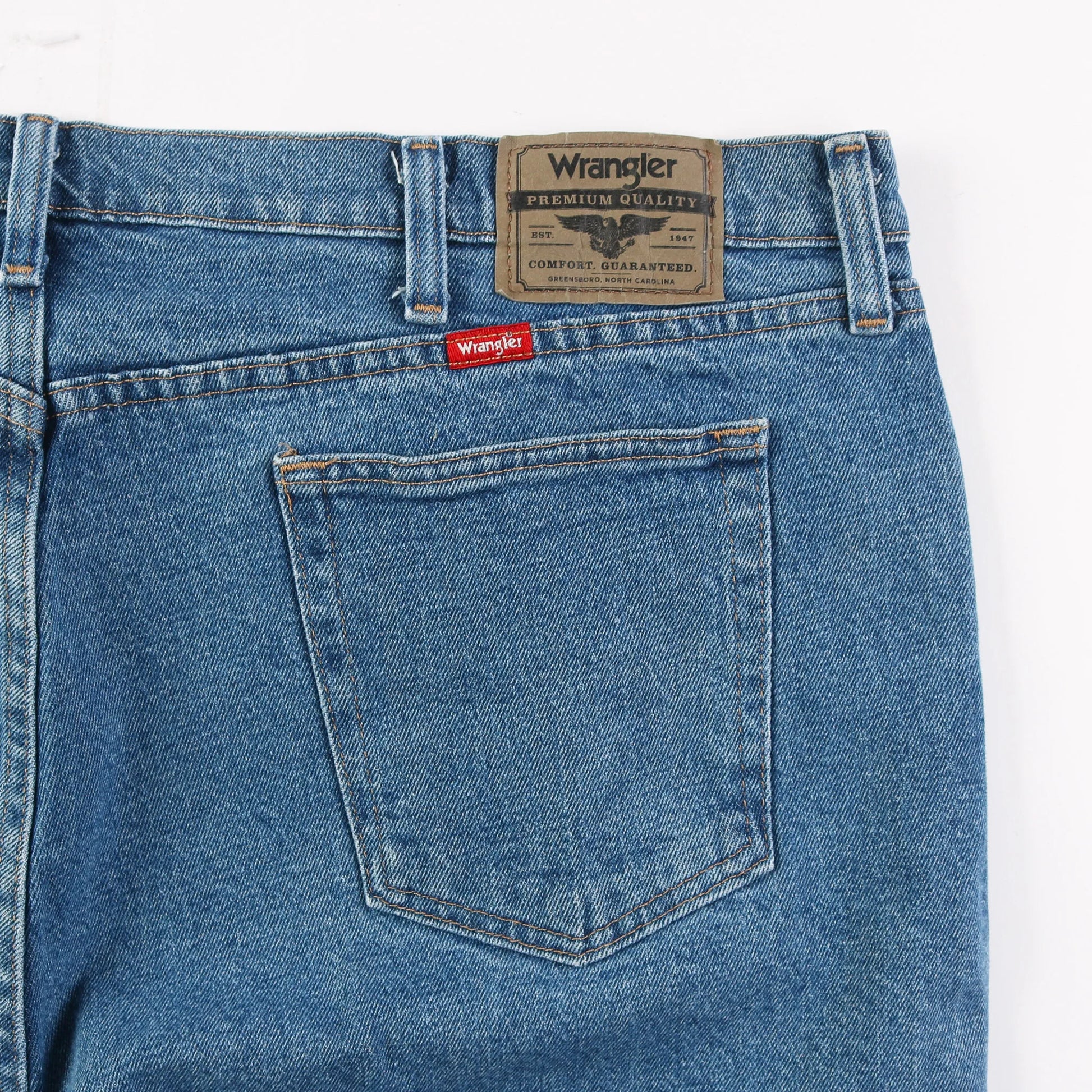 Vintage Wrangler Denim Shorts in Denim. Classic mid-wash blue denim, five-pocket styling, Wrangler logo patch, red tab branding, zip fly, sturdy cotton construction.