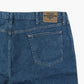 Vintage Wrangler Denim Shorts in Denim. Classic five-pocket design, branded Wrangler leather patch, metal button closure, zip fly, sturdy blue denim construction, relaxed above-the-knee fit.