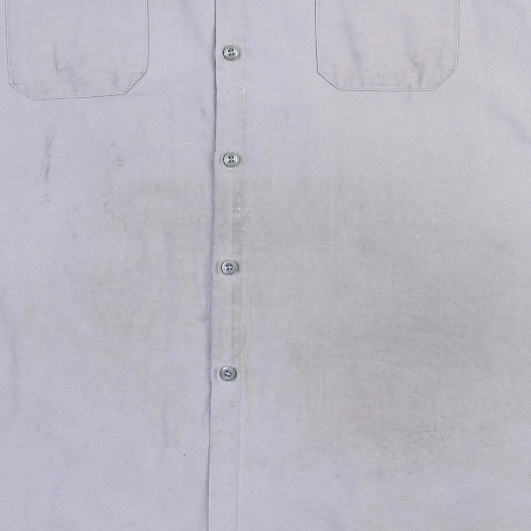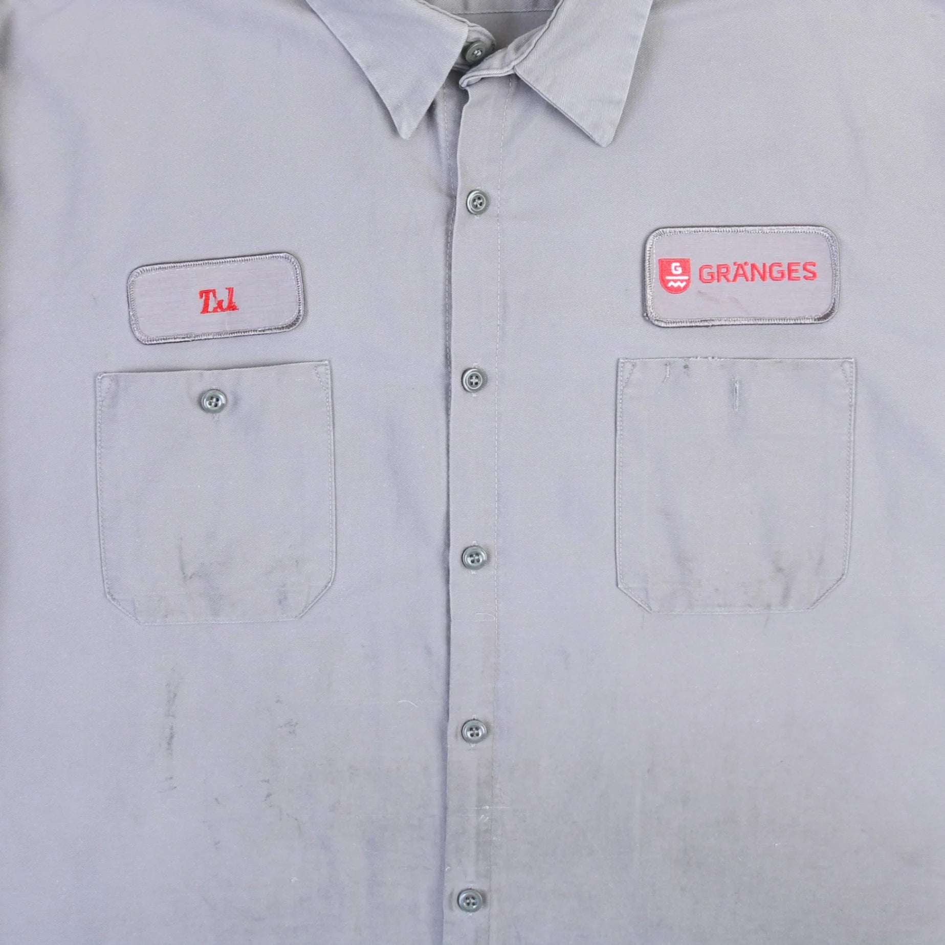 Vintage Garage Shirt in grey. Gray, button-up, chest embroidery including personalized and brand patches, point collar, durable fabric typical of workwear.