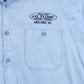 Vintage Garage Shirt Work Shirt in Blue. Light blue polyester/cotton work shirt with two buttoned chest pockets, black embroidered company patch, long sleeves, classic collar, and buttoned cuffs. Made by Red Kap, known for durable work apparel.