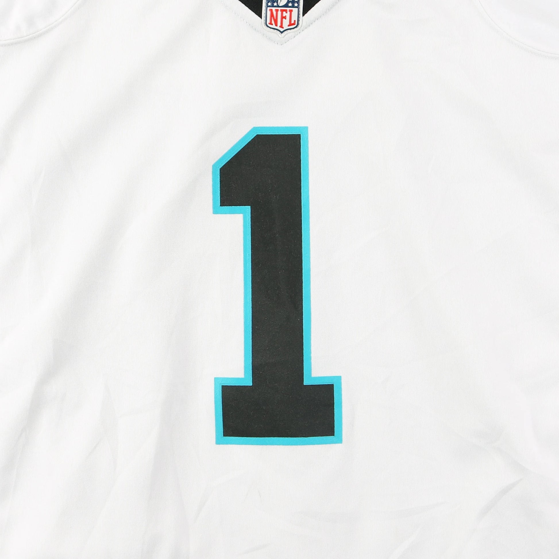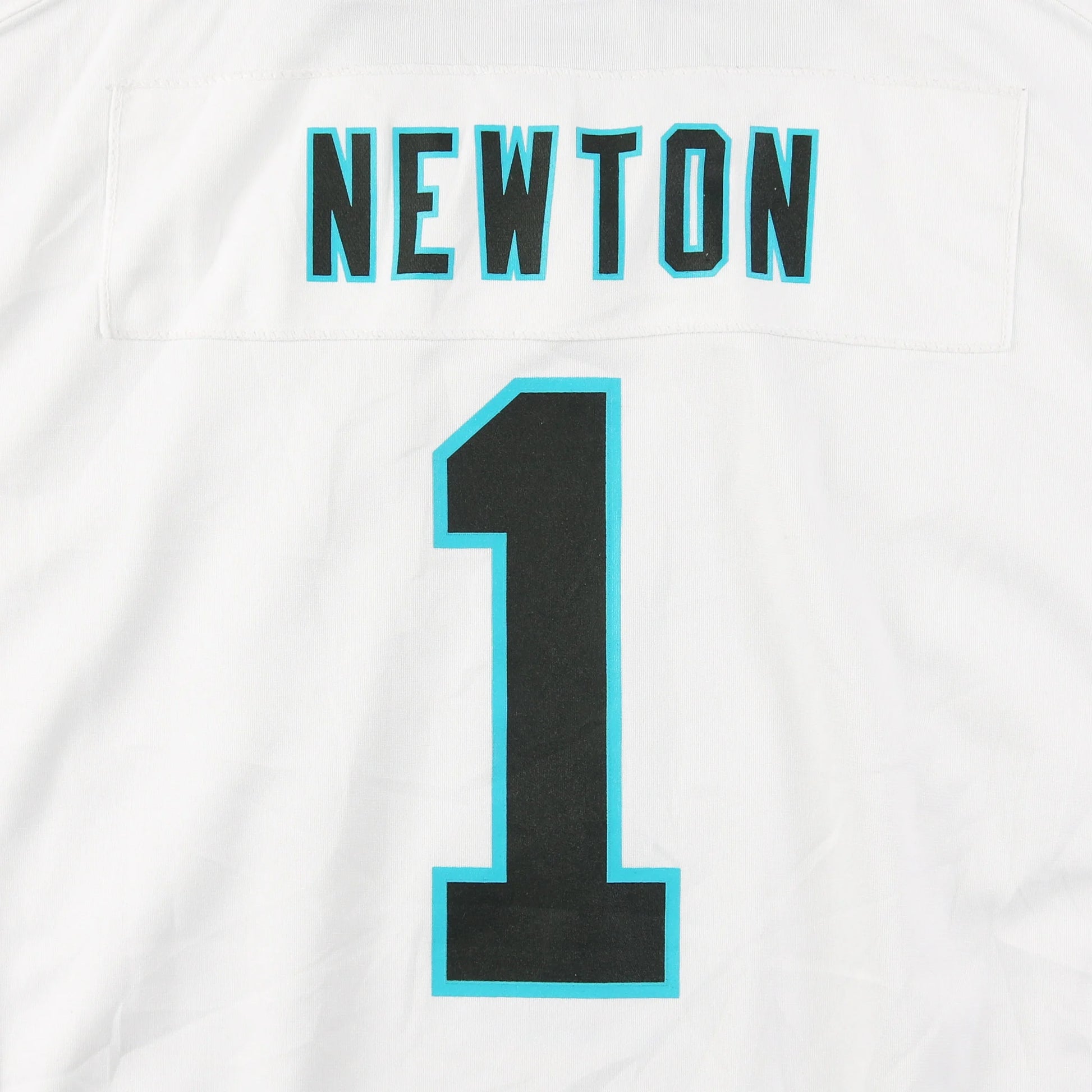 Vintage NFL Jersey in White. White NFL jersey with teal and black details, mesh paneling, "KEEP POUNDING" detail on the collar, Panthers logo on each sleeve, and "NEWTON"/number 1 on back and front.