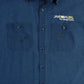 Vintage Garage Shirt Short-sleeve Work Shirt in Navy. This vintage short-sleeve shirt features an embroidered logo, buttoned front closure, and two chest pockets. The workwear design is both practical and stylish, suitable for various casual and professional settings.