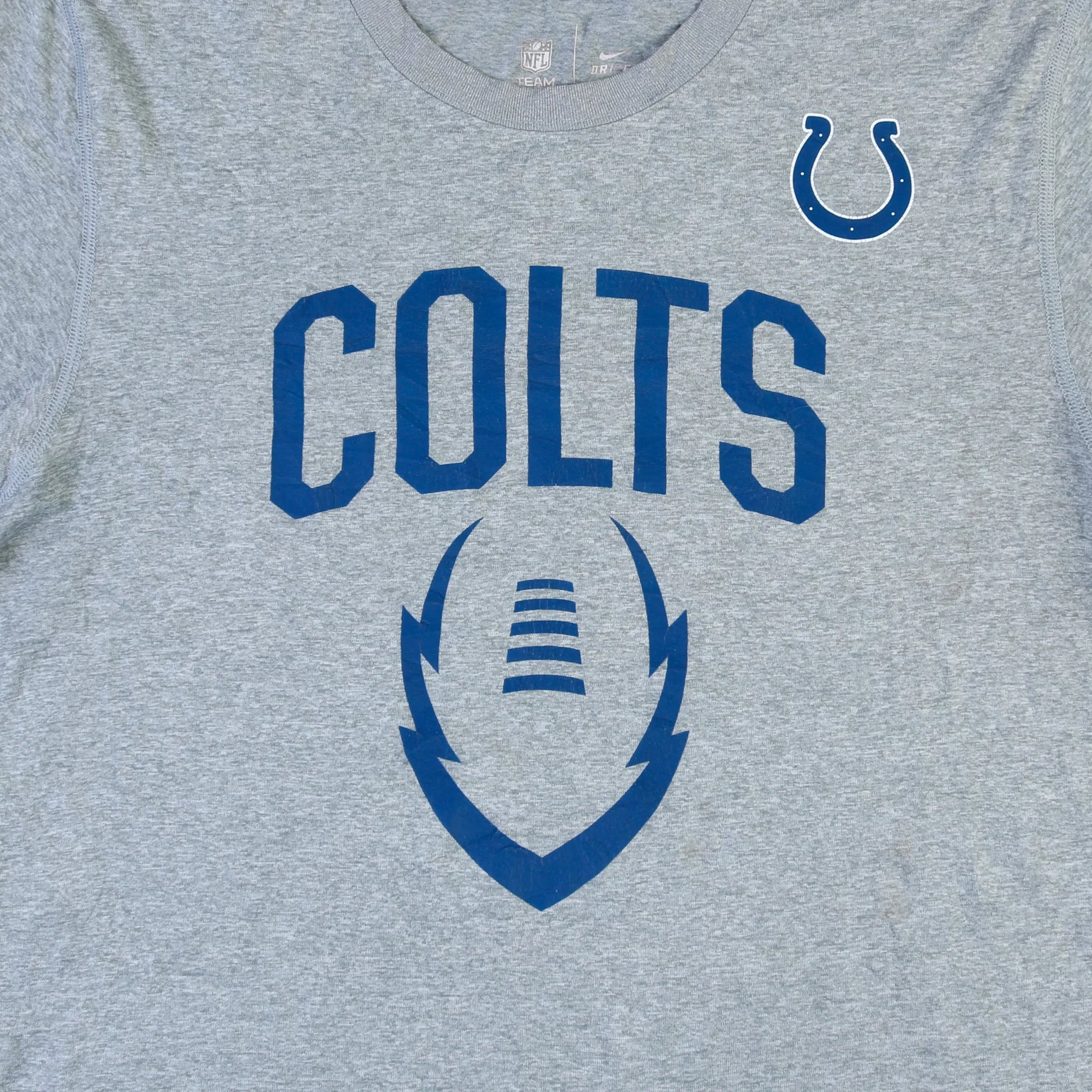 Nike's Dri-Fit technology revolutionized athletic wear by offering sweat-wicking, comfortable fabrics ideal for sports and daily wear. The Indianapolis Colts, a well-known team in the NFL, have developed a strong following with their classic blue-and-white branding. Team t-shirts like this are popular both with dedicated fans and as streetwear collectibles. In modern fashion, NFL apparel has crossed over into casual and vintage style scenes. Nike's NFL collaboration garments are recognized for their quality and authenticity. Pieces like this continue to be favorites for both their nostalgic value and practicality.