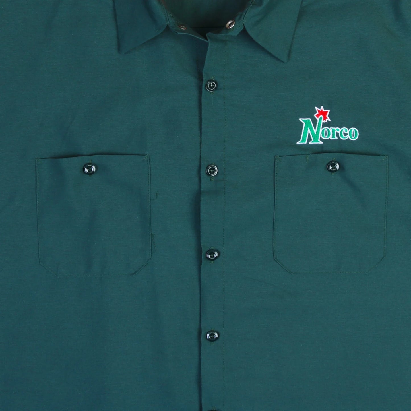 Red Kap is known for durable workwear featuring functional and practical designs. The 'Norco' embroidery suggests a vintage aesthetic with possible corporate or branded significance. Such shirts often appear in mechanic, warehouse, or service industry uniforms, a testament to their rugged usability. Today, these pieces are appreciated not just for work but also for casual and stylish vintage-inspired outfits. The green color adds a distinctive yet versatile flair, resonating with retro fashion enthusiasts. This item is a blend of functionality and nostalgic charm, making it sought after among collectors.