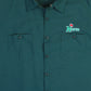 Vintage Garage Shirt in green. Short-sleeved green work shirt with button-up closure, dual chest pockets, and a 'Norco' embroidery. Durable fabric, ideal for casual or workwear.