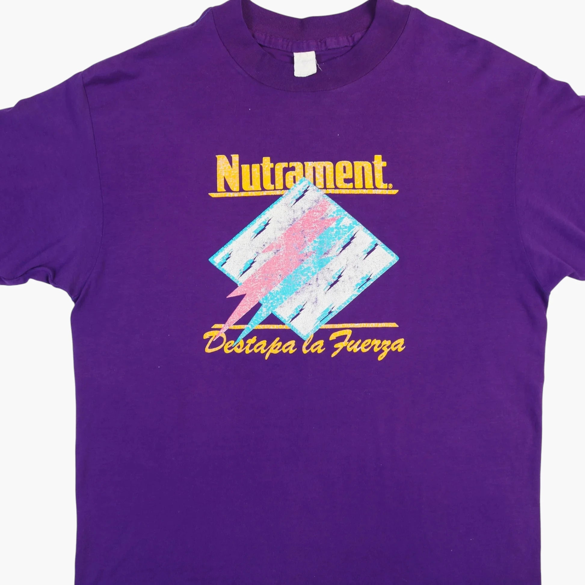 Vintage T-shirt in Purple. This shirt displays a prominent yellow 'Nutrament' logo above a multicolored abstract design. Below the artwork, the phrase 'Destapa la Fuerza' adds regional charm.