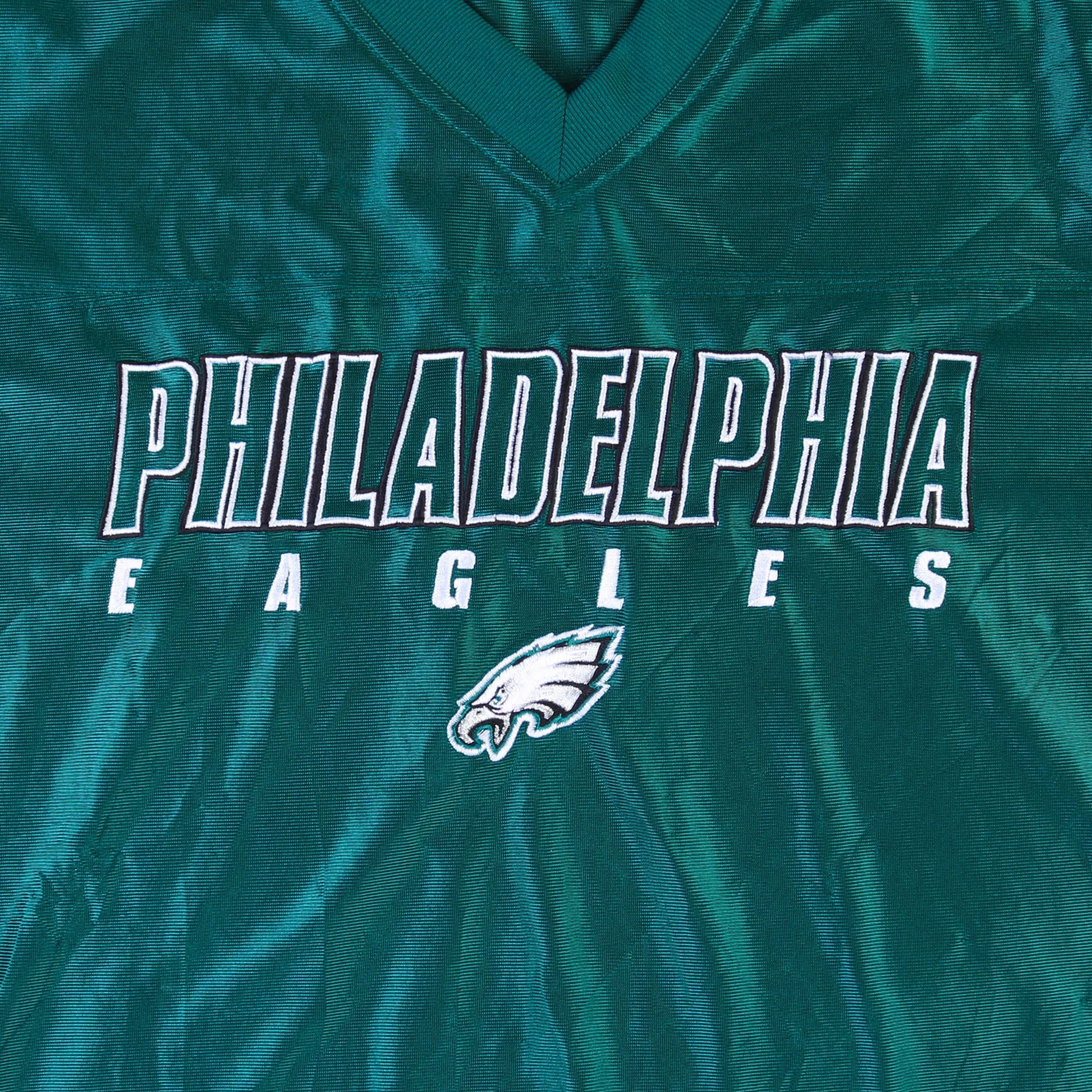 Vintage NFL T-shirt/jersey in Green. Iconic green polyester with ribbed v-neck, black sleeve stripes, bold PHILADELPHIA EAGLES text and logo embroidered on front, plain back, classic 90s/00s athletic jersey look.