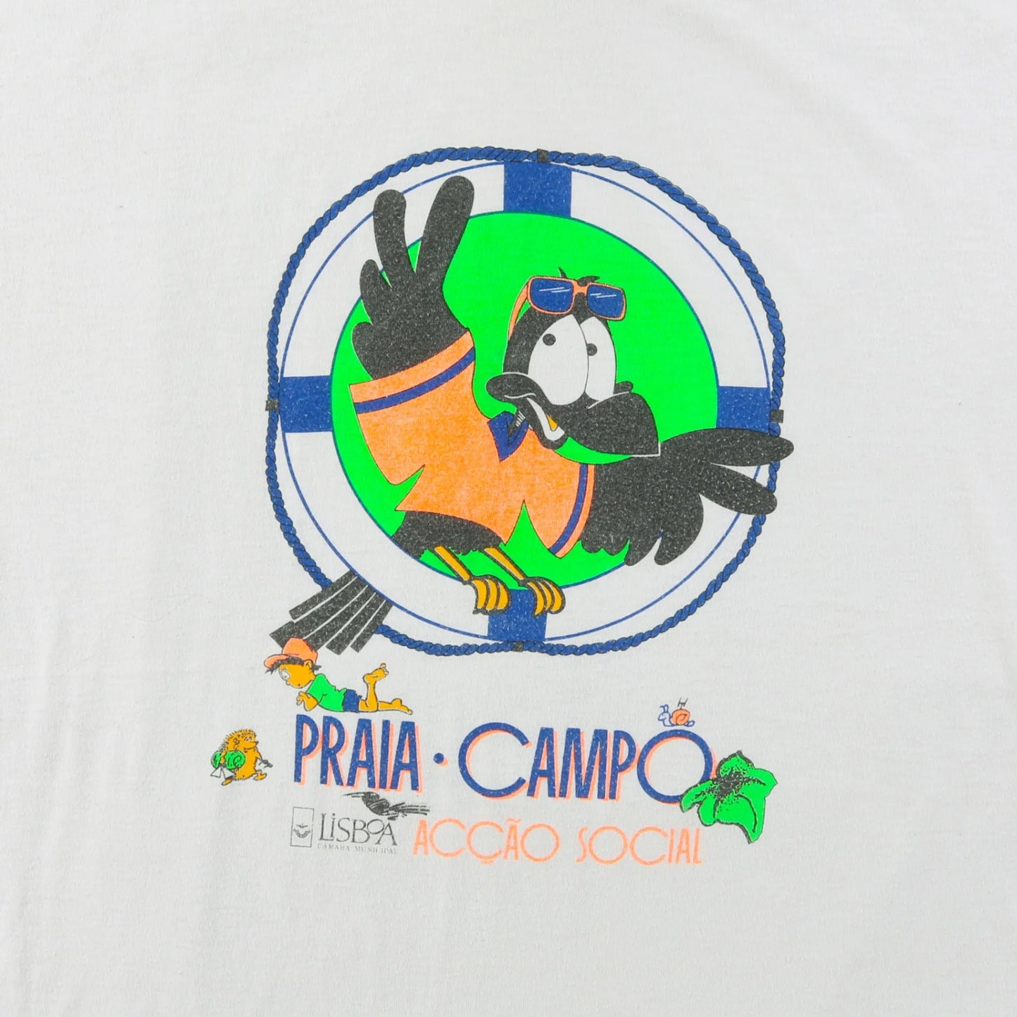 Vintage T-shirt in White. Graphic t-shirt featuring 'Praia-Campo' text and a central colorful parrot design, with Lisbon-themed graphics.