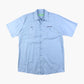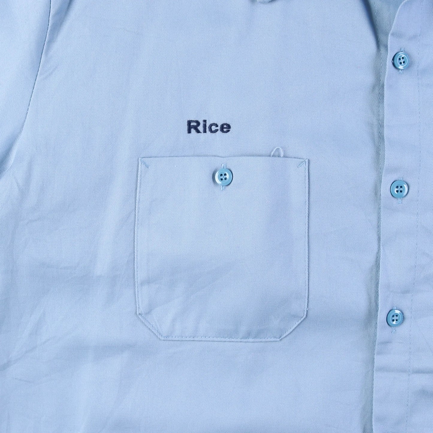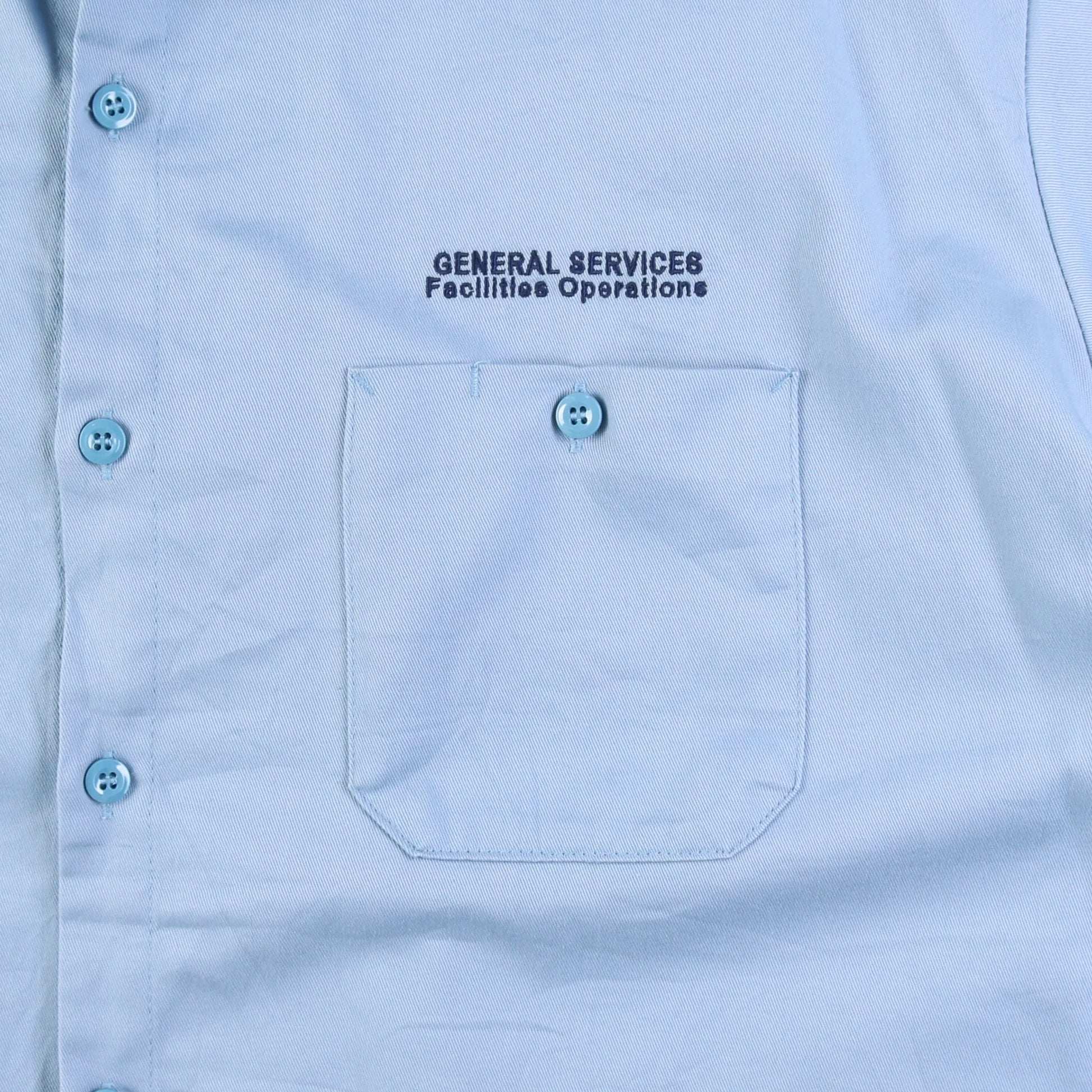 Vintage Garage Short Sleeve Work Shirt in Blue. Light blue short sleeve button-down with two chest pockets, embroidered "Rice" name patch, and "GENERAL SERVICES Facilities Operations" script. Made from a sturdy poly-cotton blend for durability. Features include original Red Kap label, functional pocket flaps, and all matching blue buttons.