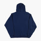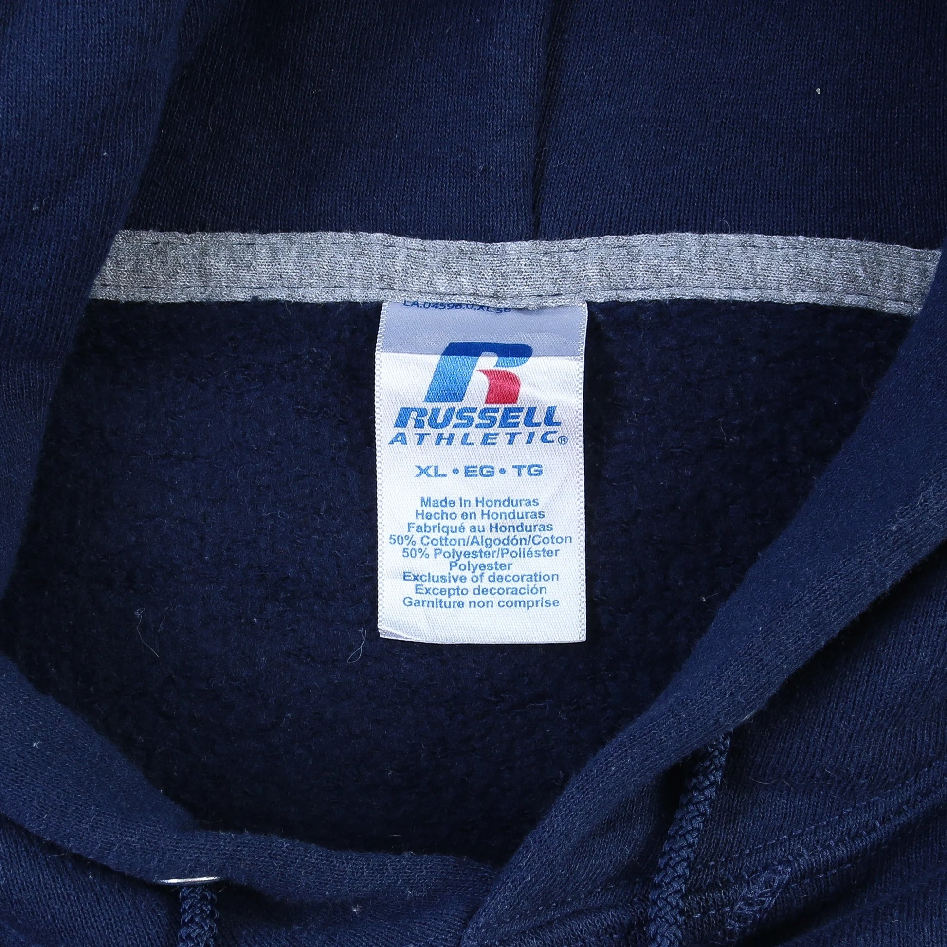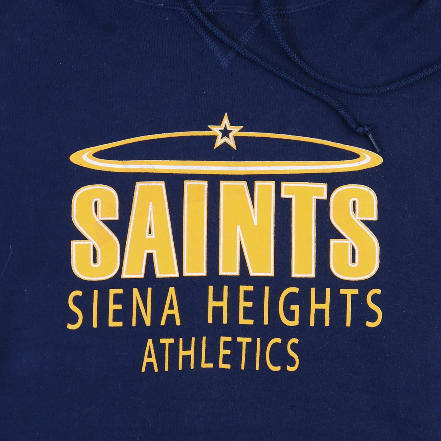 Vintage Russell Athletic Hoodie in Navy. Navy blue hoodie with yellow and white screen-printed 'Saints Siena Heights Athletics' and halo/star graphic, kangaroo pocket, drawstring hood, ribbed cuffs/hem, and a 50/50 cotton-polyester fabric blend.