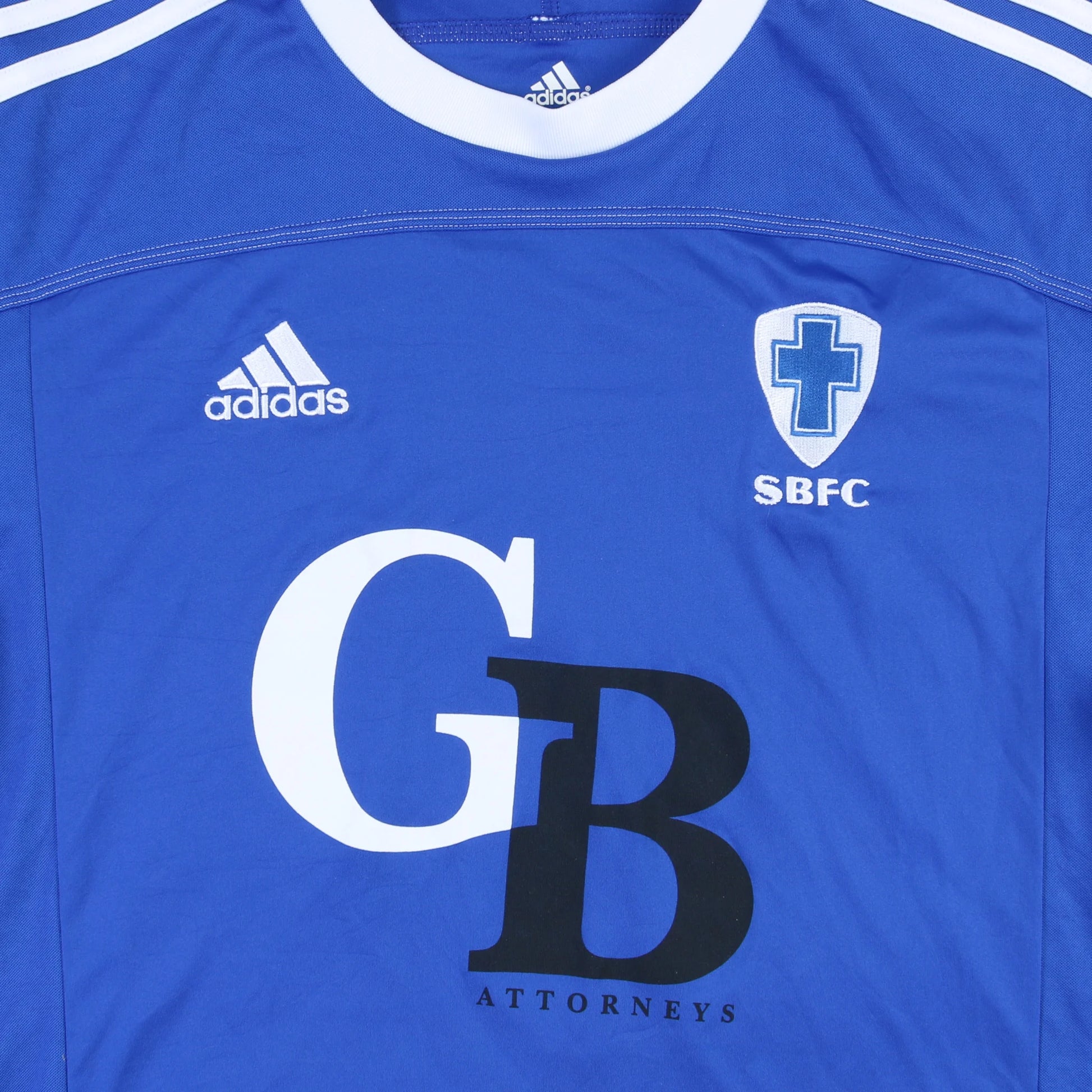 Adidas football jerseys have become iconic in both sports and streetwear culture, prized for their innovation and classic style. This SBFC jersey with ClimaLite fabric reflects Adidas' ongoing commitment to high performance and player comfort. Sponsor logos and team crests add visual appeal and represent the commercial side of modern football. Vintage football shirts like this are now sought after by collectors and fans enamored with retro aesthetics. The blue color and crisp detailing preserve its standout look from the pitch to everyday fashion. Today, such shirts are styled not only for play but also as nostalgic statements and sportswear staples.